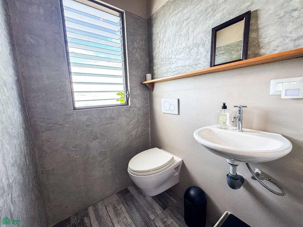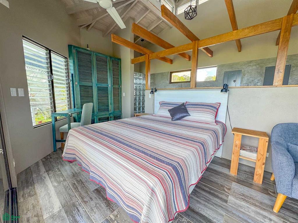 The unique 1-bedroom, 2-bathroom home is designed to maximize its tropical setting, featuring a full ground-level covered patio ideal for outdoor living and entertaining, and a bright upper level with panoramic windows and unforgettable ocean views. A separate cabin offers excellent potential as a guest space, office, or rental unit.