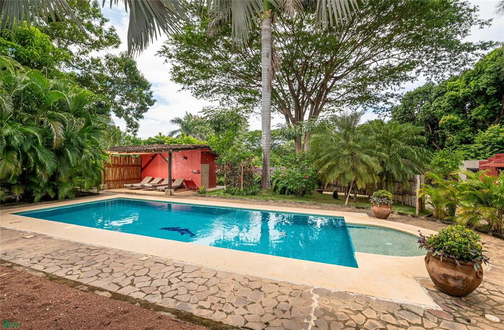 This spacious residential property in Villarreal, just 10 minutes from Tamarindo, offers strong rental income potential. Set on 3,300 m2 of land, it includes 7 buildings and a 40 m2 pool surrounded by lush tropical gardens. Six of the seven residences are currently rented, ensuring steady income throughout the year. The main house features 165 m2 with 3 bedrooms, 2 bathrooms, and a large terrace, complemented by outdoor ranchos and a barbecue area. Three identical houses of 95 m2 each provide 2 bedrooms and 2 bathrooms, while two bungalows of 25 m2 each offer compact living spaces. A storage room with studio adds renovation potential. The property is sold furnished, with air conditioning, an electric gate, and both public water and an artisanal well. Fruit trees and native plants enhance the tropical atmosphere. Priced at $799,000, this is an excellent investment opportunity with room for expansion and high demand for rentals due to tourism.