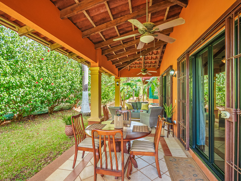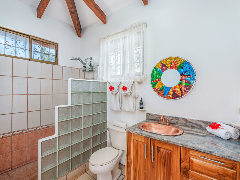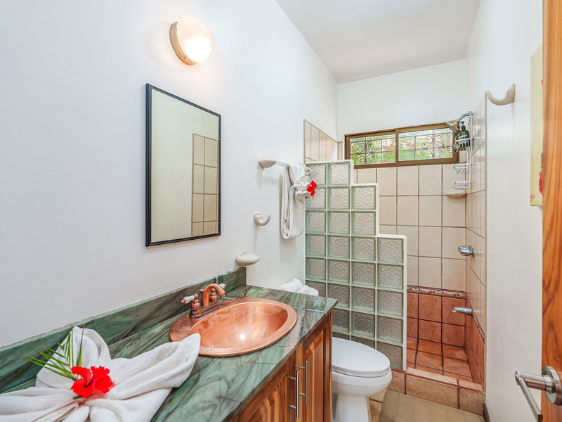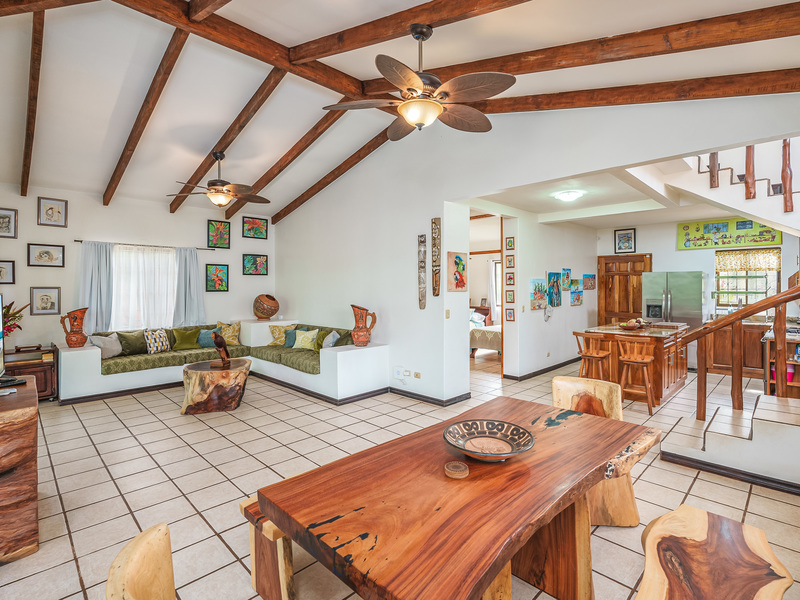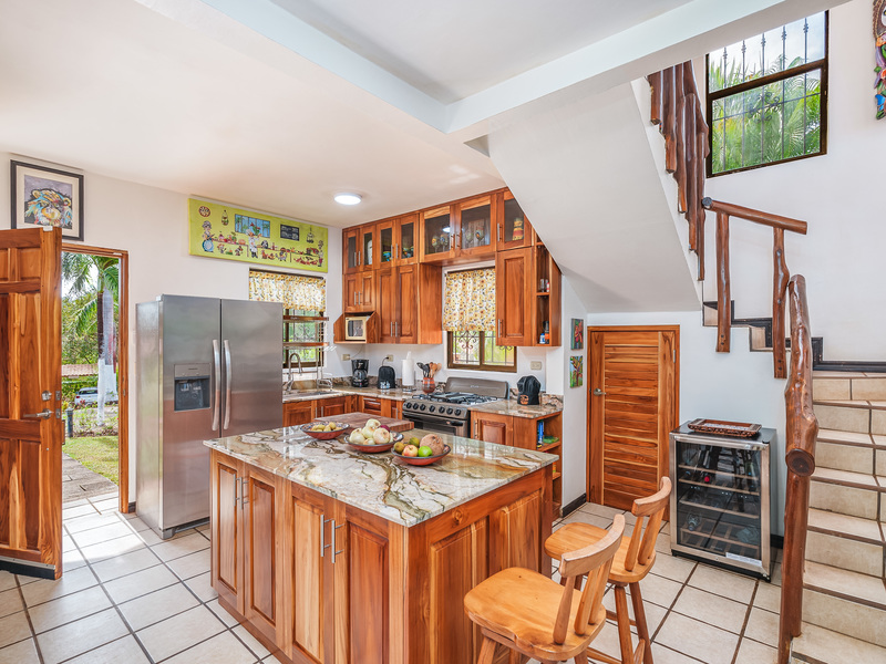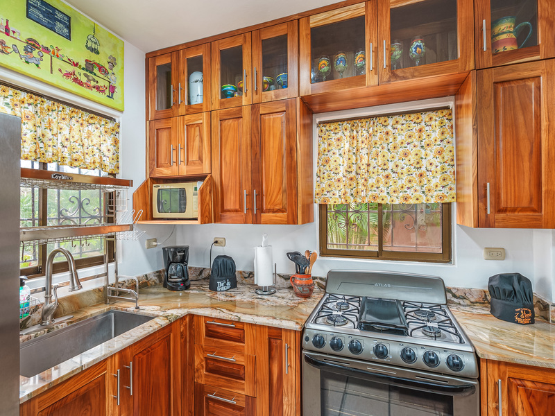 What sets Villa #6 apart is the level of finish and furnishing. The kitchen has been fully remodeled with custom teak cabinetry, granite countertops, and the addition of a central island—creating a more functional and social cooking space. Teak cabinetry continues into the bathrooms, reinforcing a cohesive, durable, and distinctly Costa Rican material palette. The home is offered fully furnished, with carefully selected, high-quality pieces including a standout solid wood dining table characteristic of Guanacaste craftsmanship.