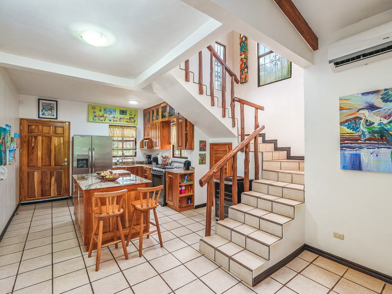 The first level is anchored by an open living and kitchen area that connects directly to a spacious rear patio—ideal for enjoying Guanacaste's spectacular weather. A guest bedroom and full bathroom complete the main floor. Upstairs, the primary suite opens to a private terrace, offering a quiet vantage point for sunset light and the surrounding tropical canopy.