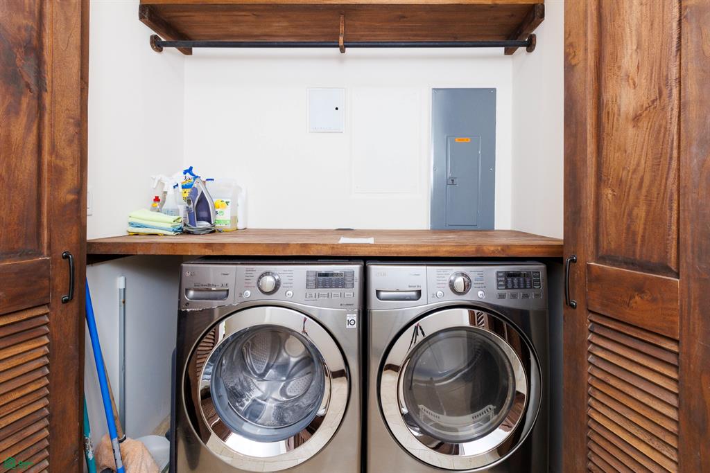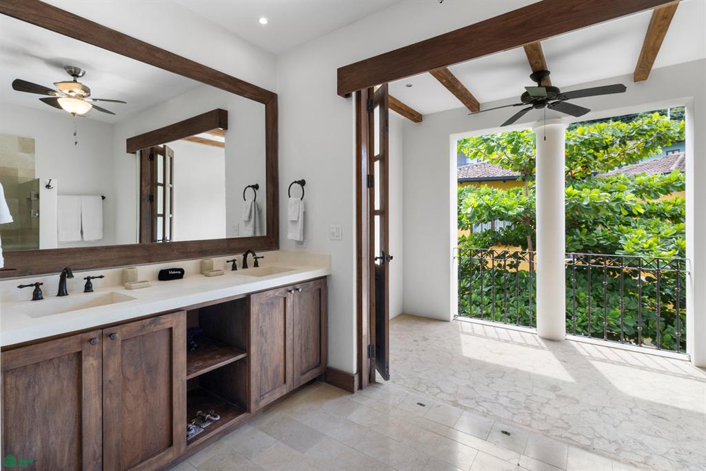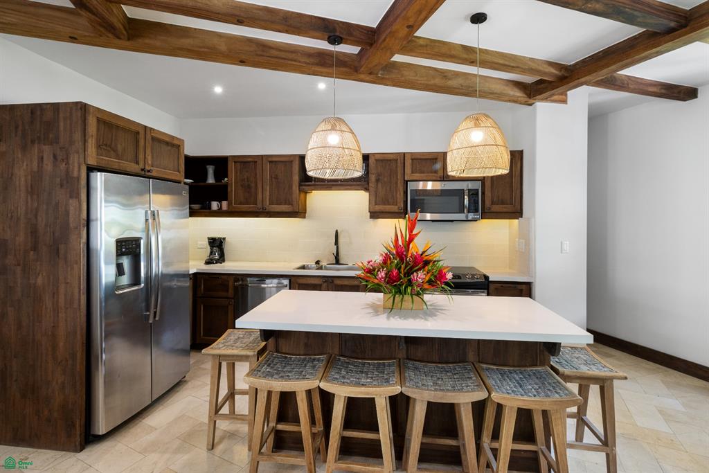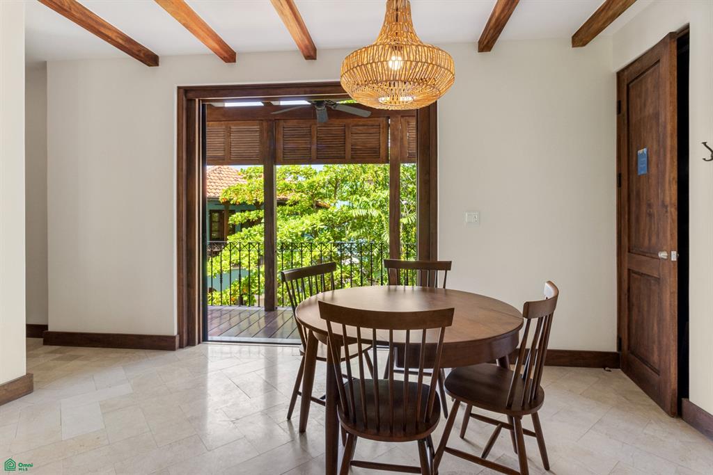 Inside, the open concept layout is filled with natural light, enhancing the warm textures and thoughtful finishes throughout. Brand new white quartz countertops elevate the kitchen, complemented by beach-inspired lighting and locally crafted Melina wood cabinetry, doors, shutters, and exposed ceiling beams. Every detail reflects quality craftsmanship and understated tropical elegance.