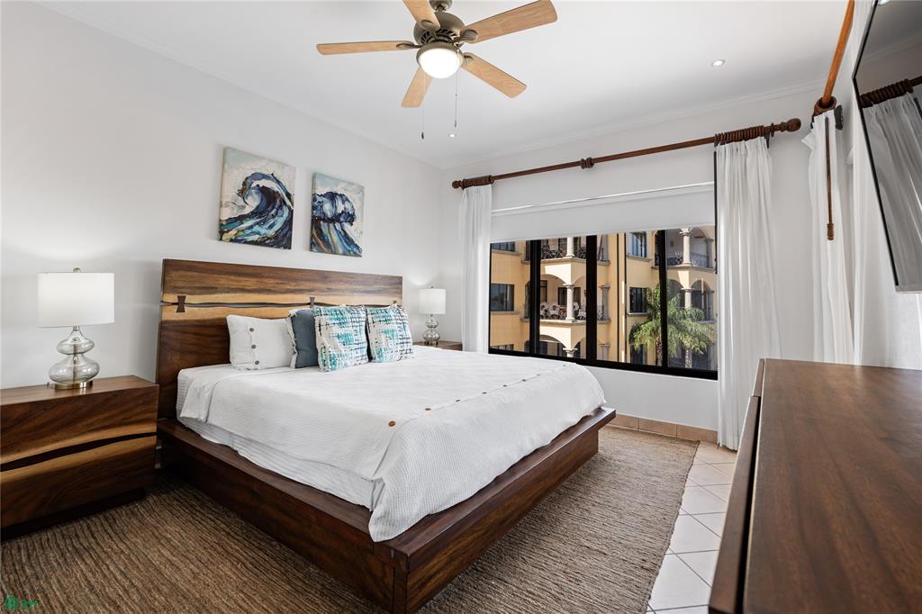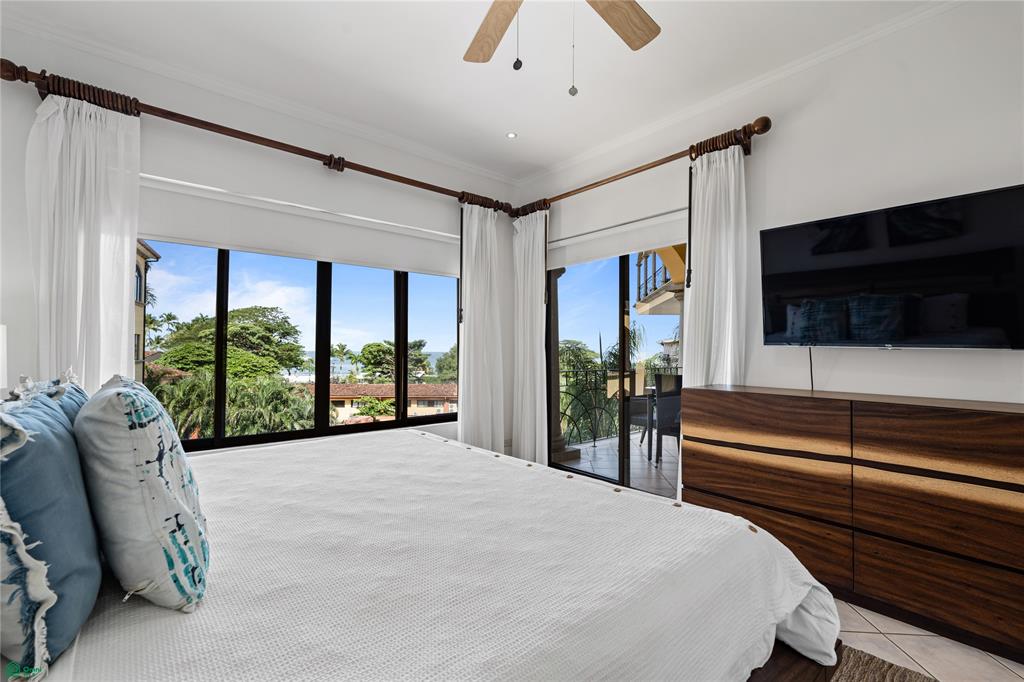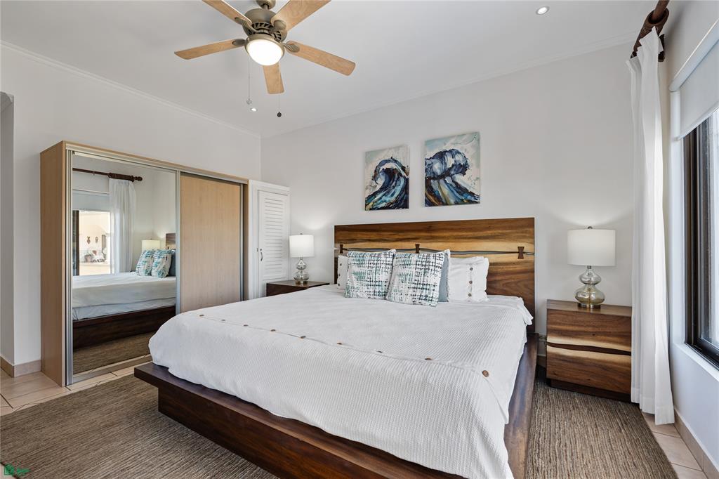 The primary bedroom has a full en-suite, king-size bed made of exotic wood, automatic blinds, and a stunning view of the ocean right from your pillow.