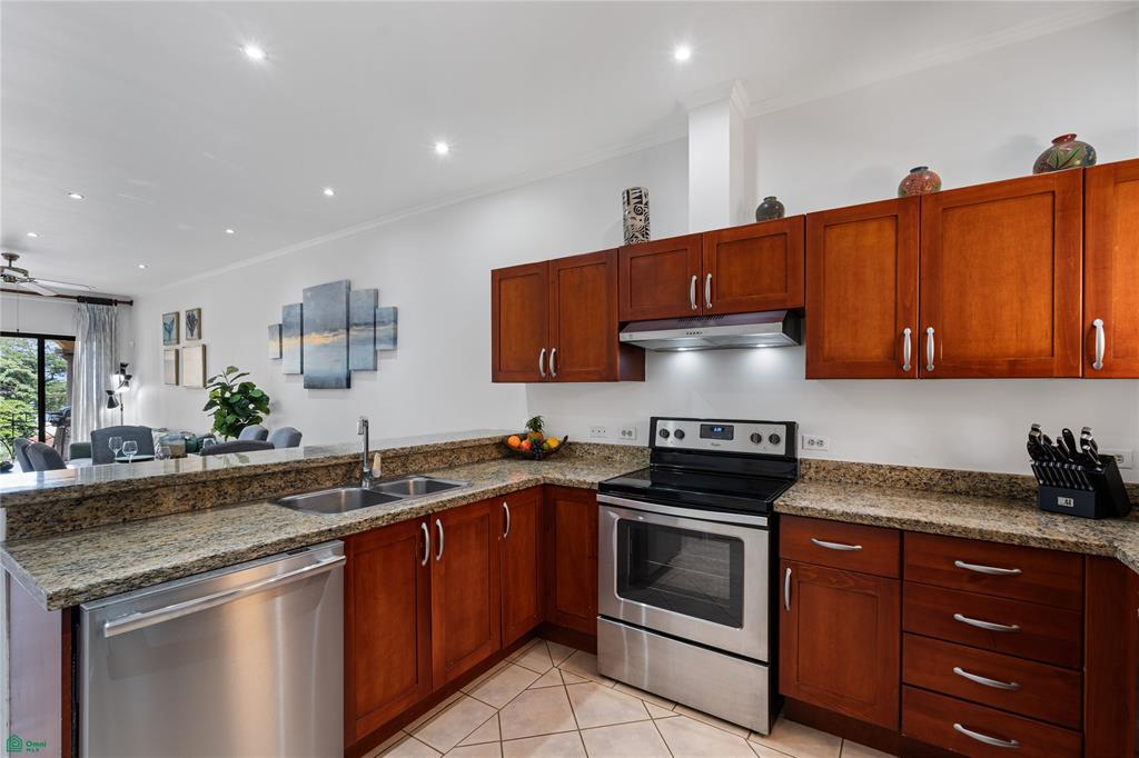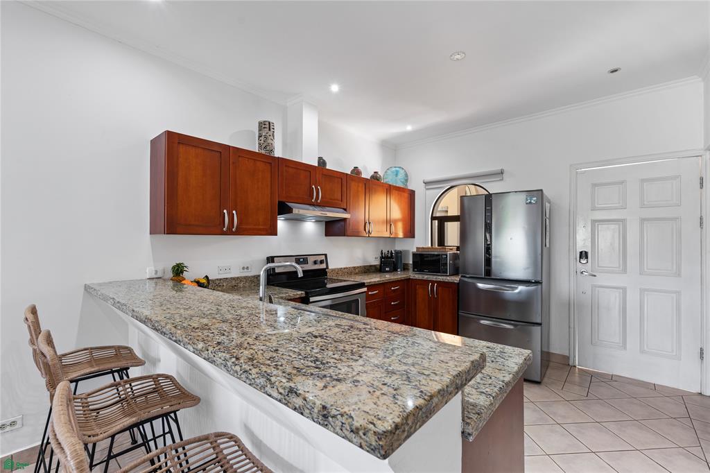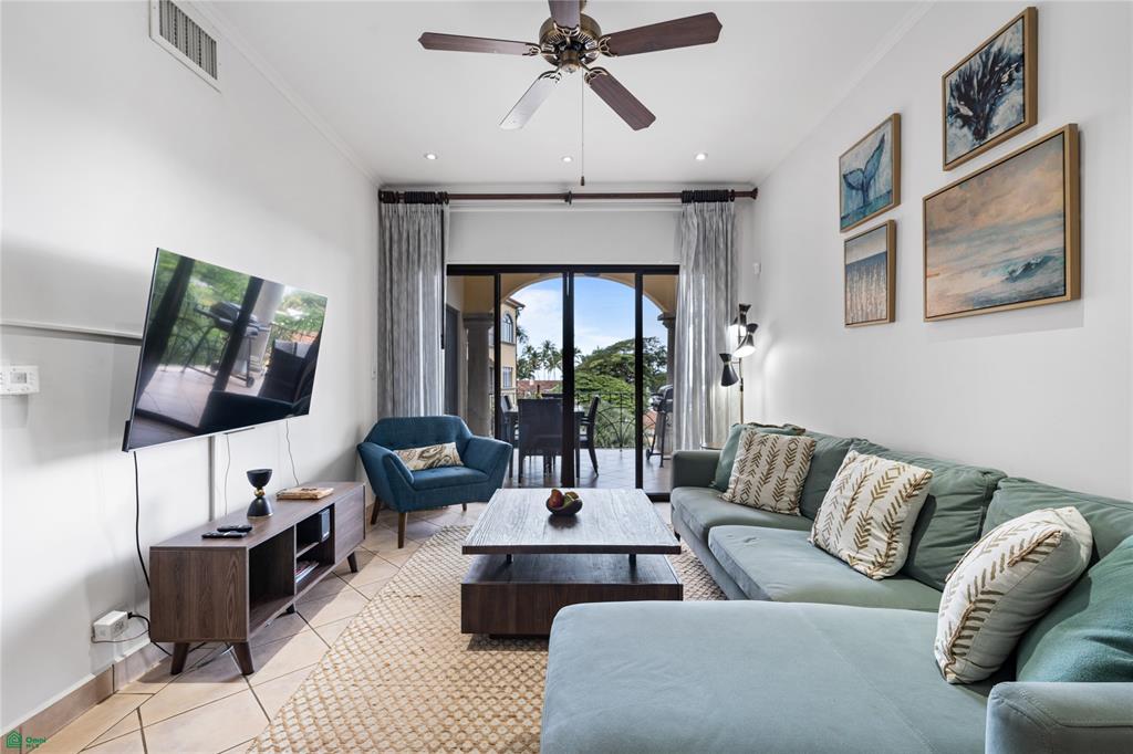 As you move towards the living area, there is a gorgeous custom-made Guanacaste dining table with seating for 6. The open-concept floor plan takes you to the spacious living room and patio, where you will find incredible ocean views. Enjoy sitting on the patio with a cold beverage and BBQ while listening to the waves crashing just 150 meters away.