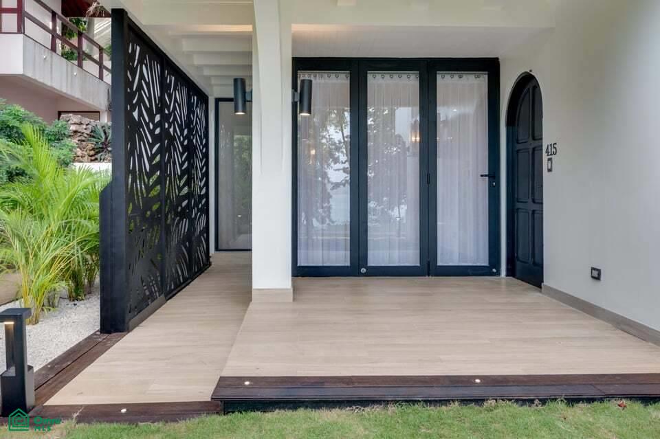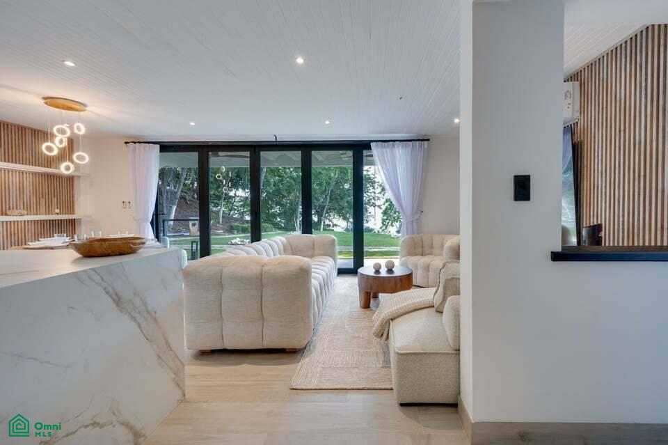 The main living area opens seamlessly to the exterior through large folding doors that lead to a secluded patio, creating an easy indoor-outdoor flow. Soft neutral colors, organic finishes, and thoughtfully selected furniture give the home a warm, cohesive feel.