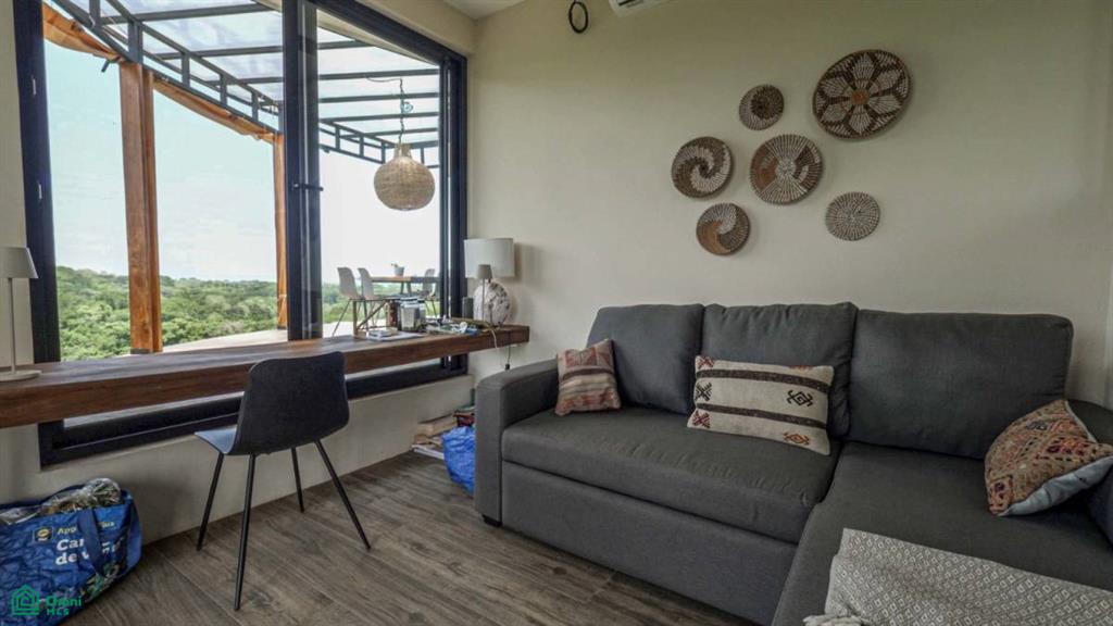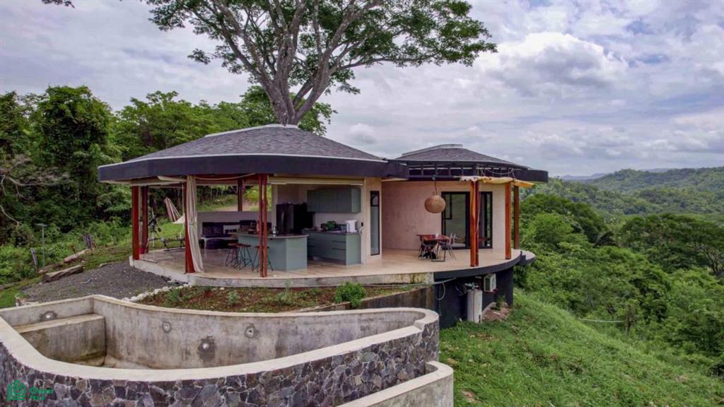 At the highest point of the property sits an organic-style 2-bedroom main residence, thoughtfully designed beneath a majestic Guanacaste tree. Curved walls, open living spaces, and a seamless indoor–outdoor flow create a home that feels both grounded and alive. A small pool captures cooling mountain breezes, while a solar power system supports a sustainable, independent lifestyle.