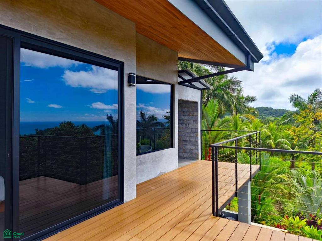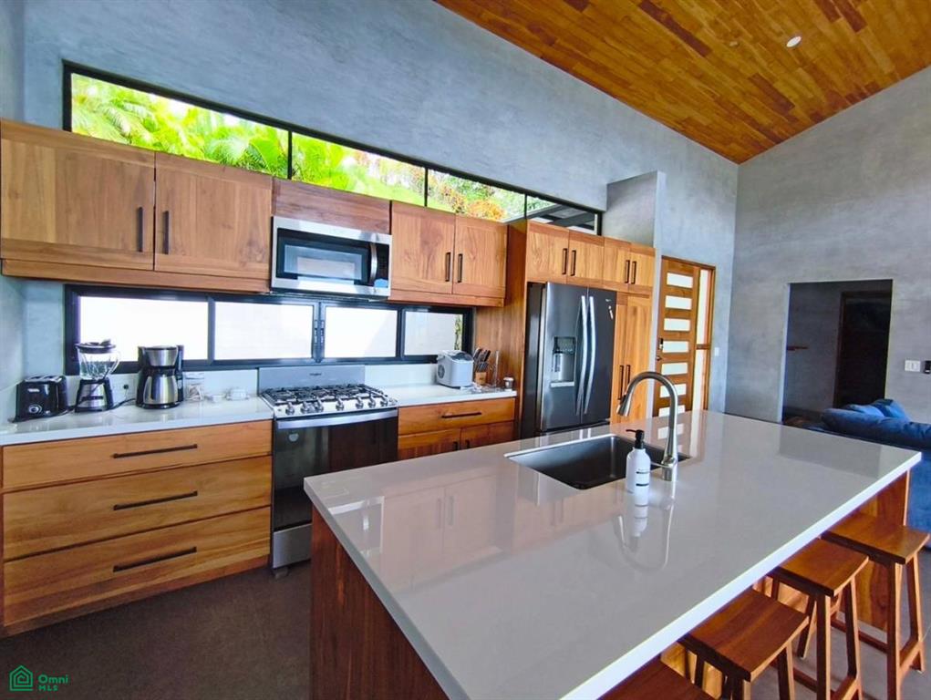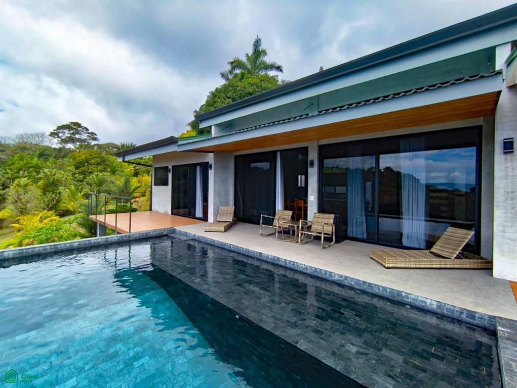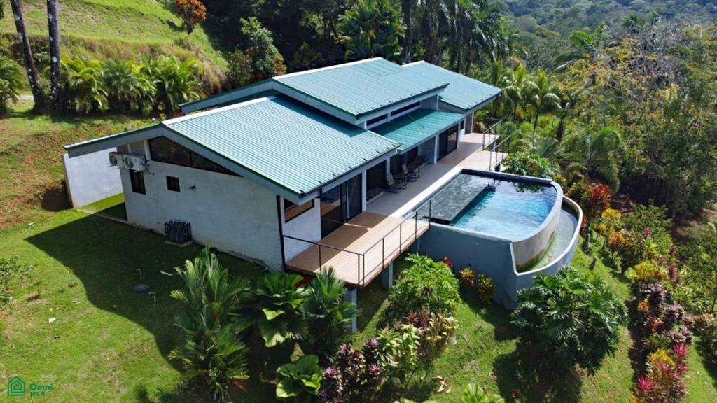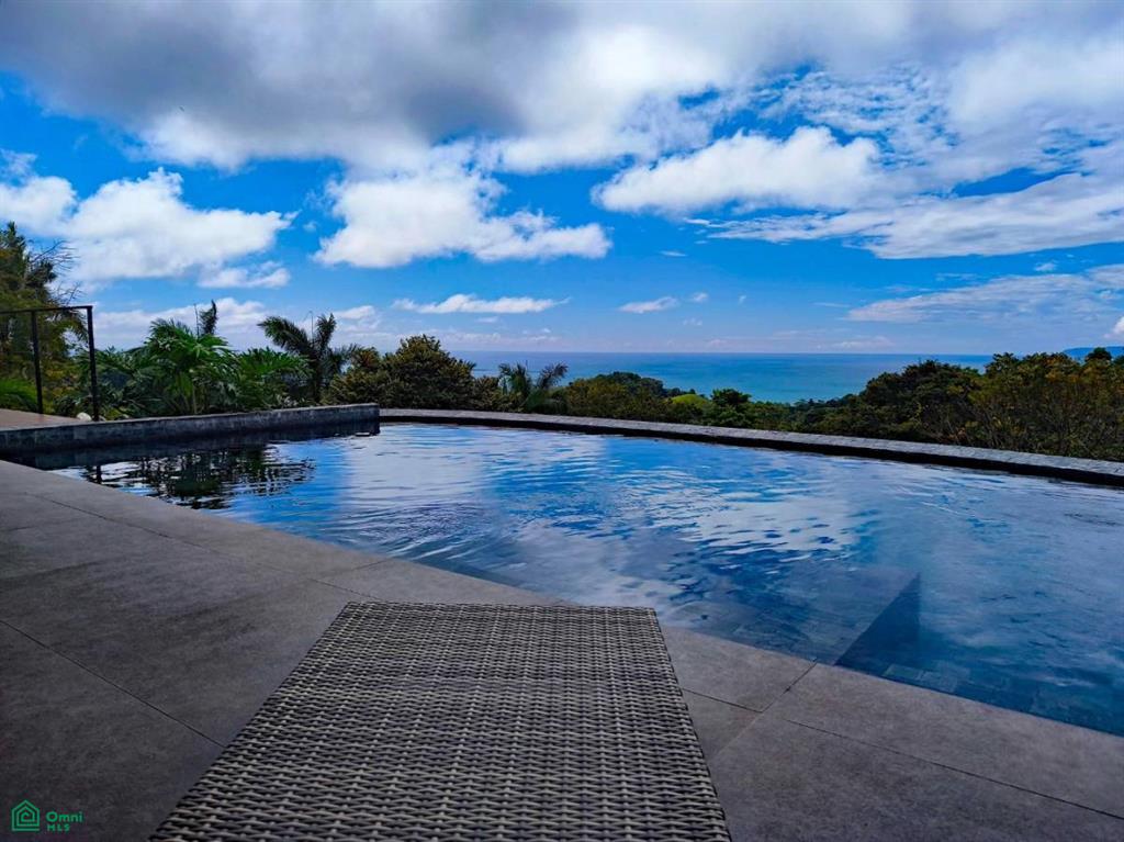 The home is built on a 4,097 m² lot (just over 1 acre) surrounded by tropical gardens and abundant wildlife. High-quality materials such as polished concrete, steel framing, hardwood cabinetry, and large sliding glass doors create a bright, durable, and elegant living environment. The open-concept living area flows directly onto the covered terrace and the infinity-edge pool, offering uninterrupted views of the ocean and rainforest.