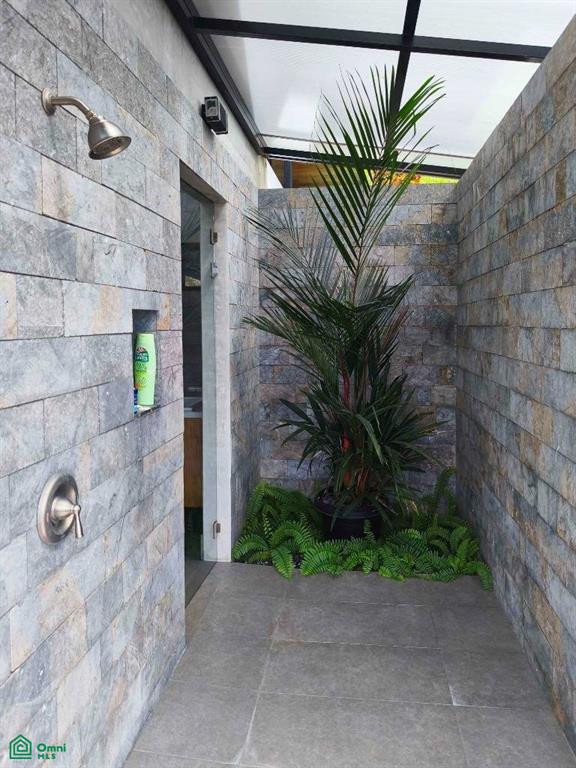 Inside, the home features a spacious living room, custom hardwood kitchen cabinetry, high-end appliances, a large center island, and vaulted wooden ceilings that enhance natural light and ventilation. Both bedrooms function as private suites with their own full bathrooms. The primary suite includes direct terrace access, a soaking bathtub with an ocean view, double vanities, and a large walk-in shower. The guest suite also offers generous space and its own private full bathroom. A stylish half bathroom and a separate outdoor shower add extra convenience.