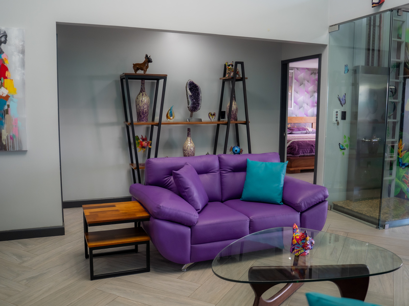 This residence boasts 2 spacious bedrooms, each designed as a private retreat with large closets and expansive windows inviting in natural light and lush mountain breezes. A stunning mezzanine office, accessible via its own internal elevator, provides a unique and inspiring workspace overlooking the home’s main social areas.