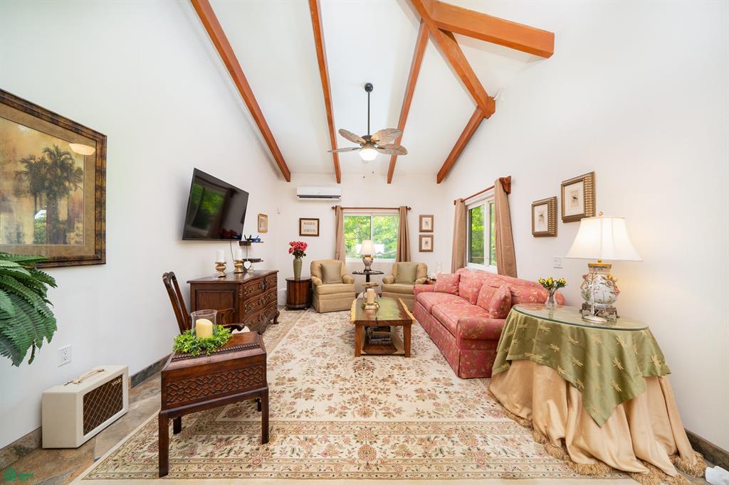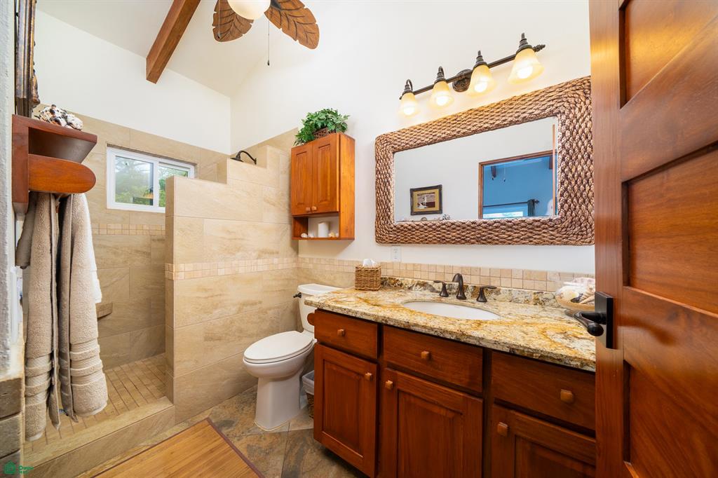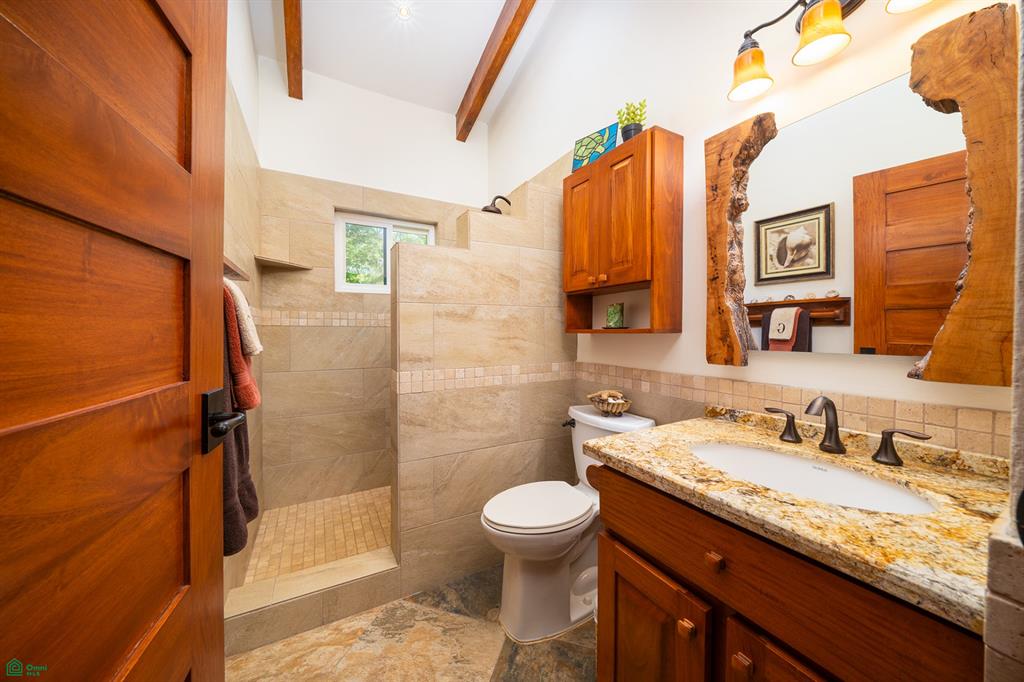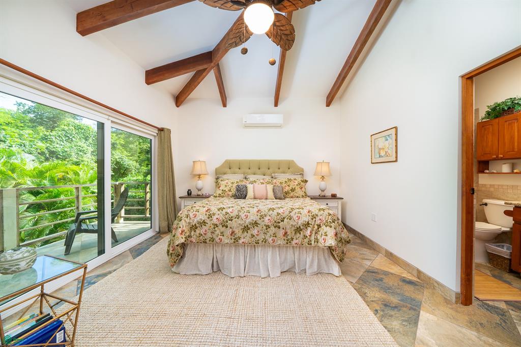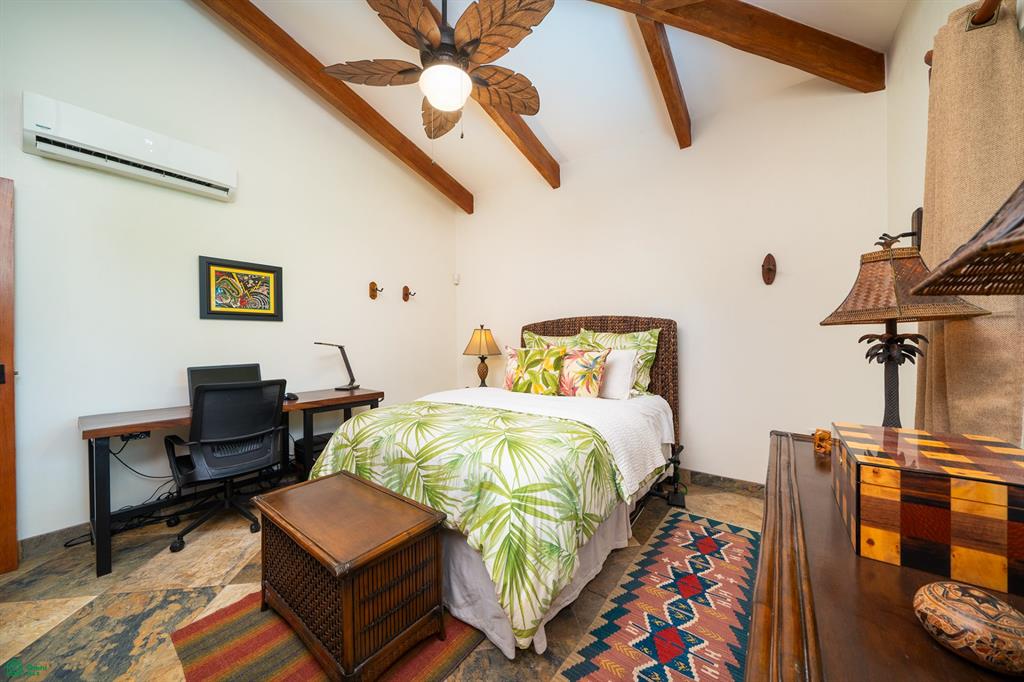 The hallway leads to a stylish 3/4 bathroom with custom tile work and cabinetry. The guest bedroom features organized closets made from Melina, a local tropical wood, adding a touch of natural beauty. Across the hall, the expansive primary bedroom boasts its own private bath, a walk-in closet, and a terrace overlooking the pool and gardens.