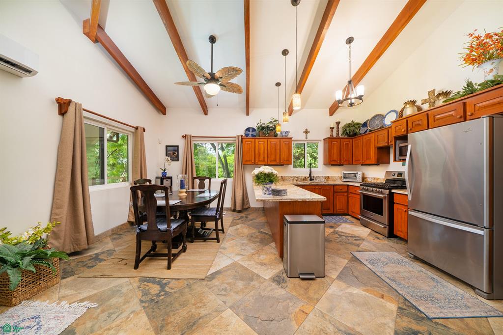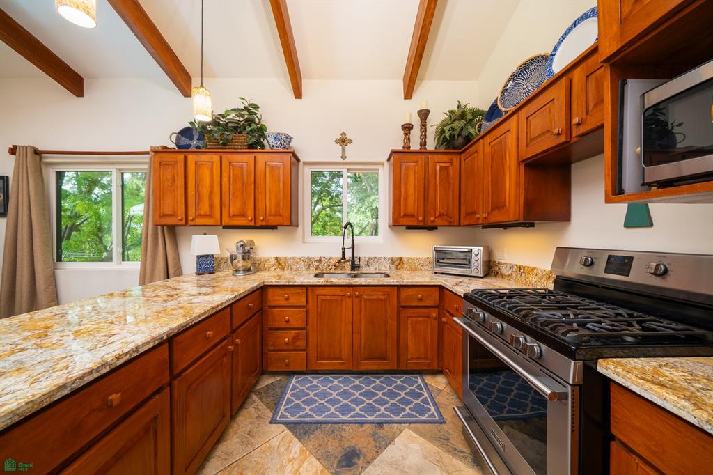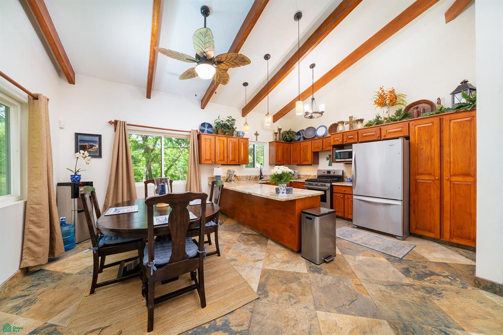 Ascending to the second story, you’ll be greeted by a generously sized terrace that overlooks the beautifully landscaped yard and surrounding trees. Step inside through the custom hardwood front door to discover a well-equipped kitchen featuring handcrafted cabinetry from local hardwoods, fine granite countertops, quality stainless steel appliances, and vaulted ceilings with exposed wood beams. The kitchen flows seamlessly into a charming dining area and a spacious, comfortable living room. Large Pella windows provide picturesque views of the lush, green surroundings, creating a serene ambiance.