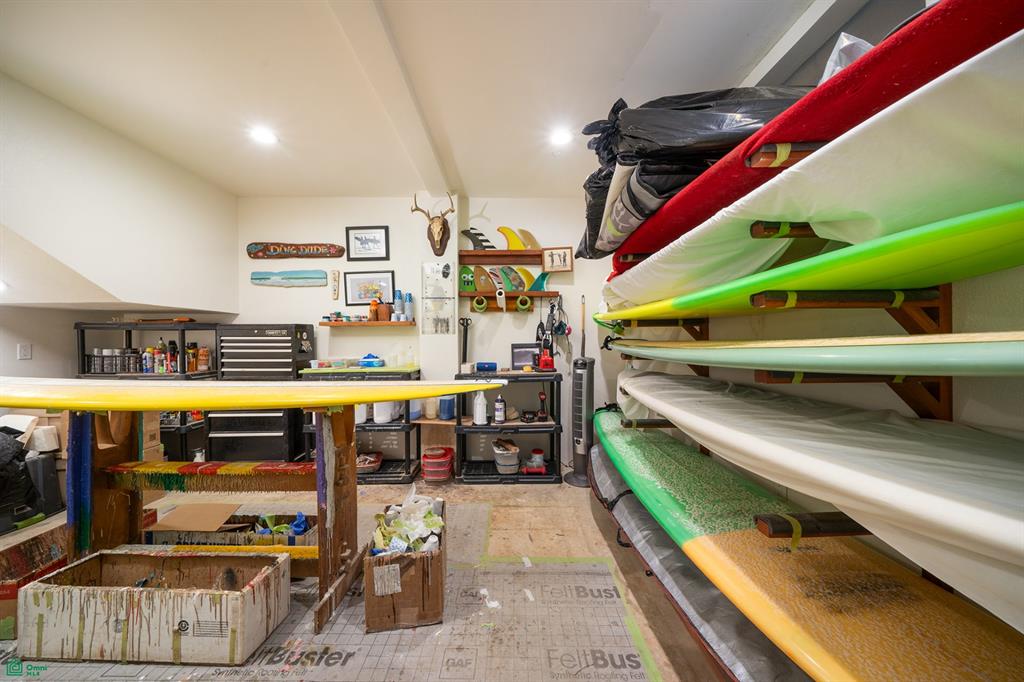 The first floor also includes a large storage area and a utility room equipped with a new washer, dryer, and sink. Adjacent to this is a versatile workspace, currently used for surfboard repair and storage, but suitable for any kind of focus on your work, whatever that may be.