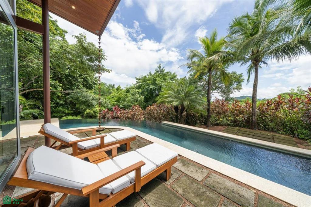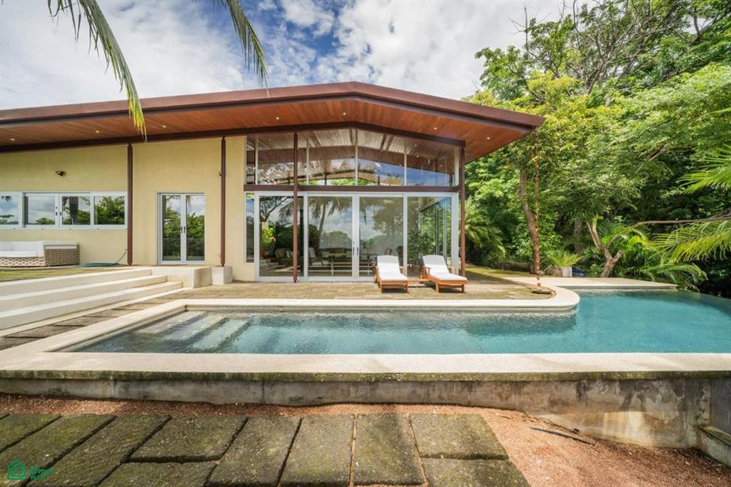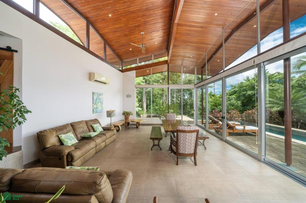 Positioned atop a lush mountain ridge, the home enjoys panoramic views of the surrounding tropical forest. The open-concept layout features high ceilings, oversized windows, and sliding glass doors that invite nature in. The kitchen, dining, and living areas flow together effortlessly, creating a light-filled, elegant space for entertaining or relaxing.