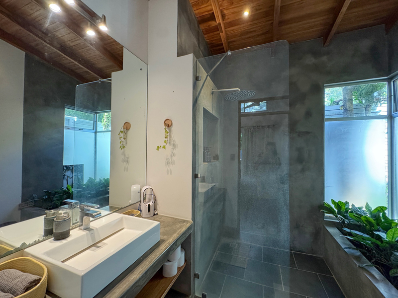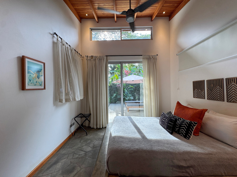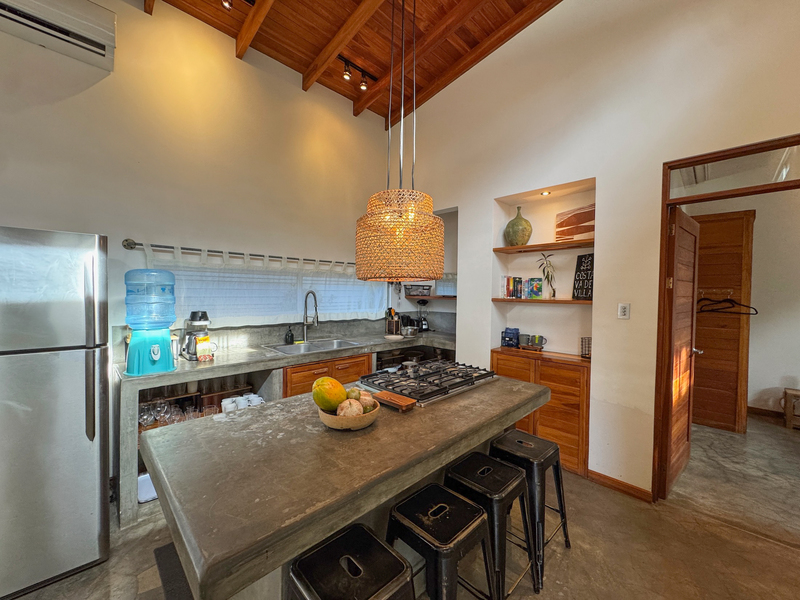 Both bedrooms feature en suite bathrooms and air conditioning, offering privacy and functionality whether used as a primary residence or vacation property. Covered parking and all public utilities are in place, including AyA water, electricity, and high-speed fiber optic internet.
