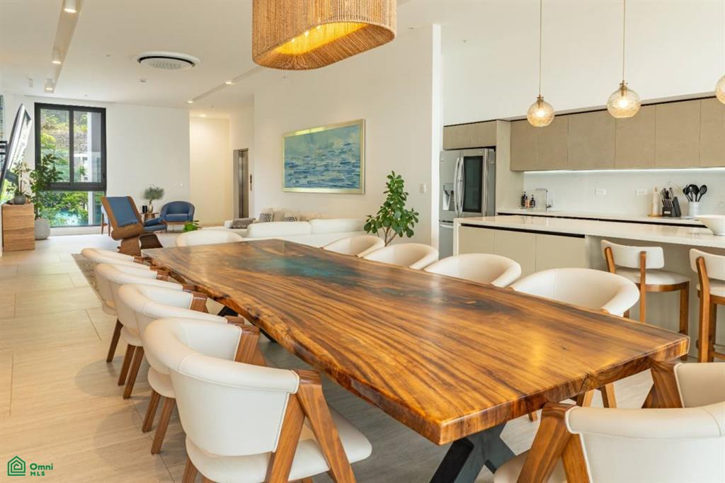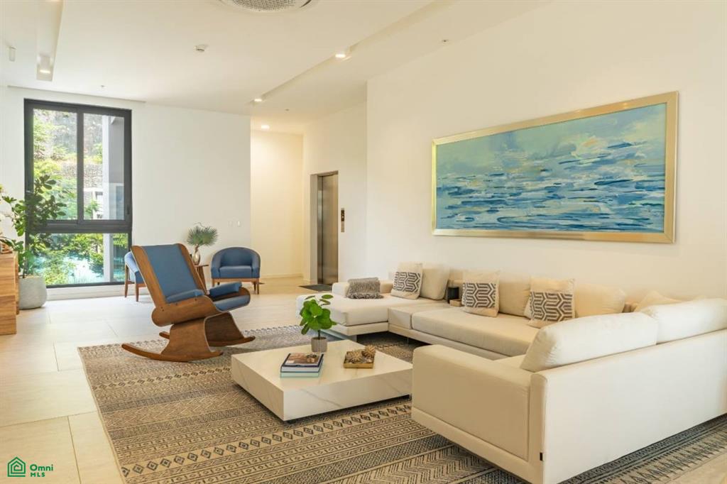 The fully furnished condo includes luxury finishes, high-end appliances, designer furniture, and a modern kitchen with Aran Cucine cabinetry and a central island that flows seamlessly into the living and dining areas. The primary suite offers panoramic ocean views, a spa-style bathroom, and terrace access, while guest bedrooms feature en-suite bathrooms, air conditioning, and private balcony access.
