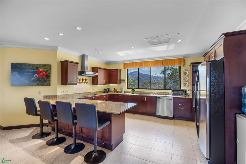 The kitchen is both functional and inviting, featuring custom wood cabinetry, granite countertops, stainless steel appliances, and a large picture window with lush mountain and treetop views. It offers ample counter space and storage, perfect for entertaining or extended stays.