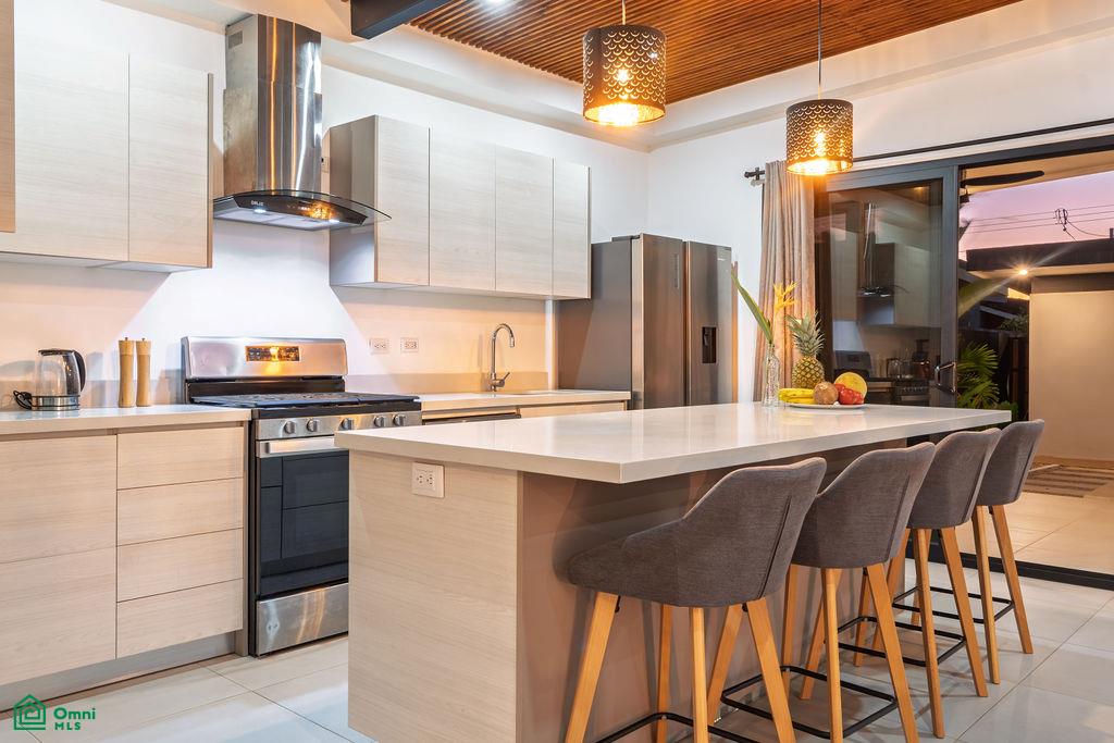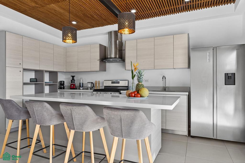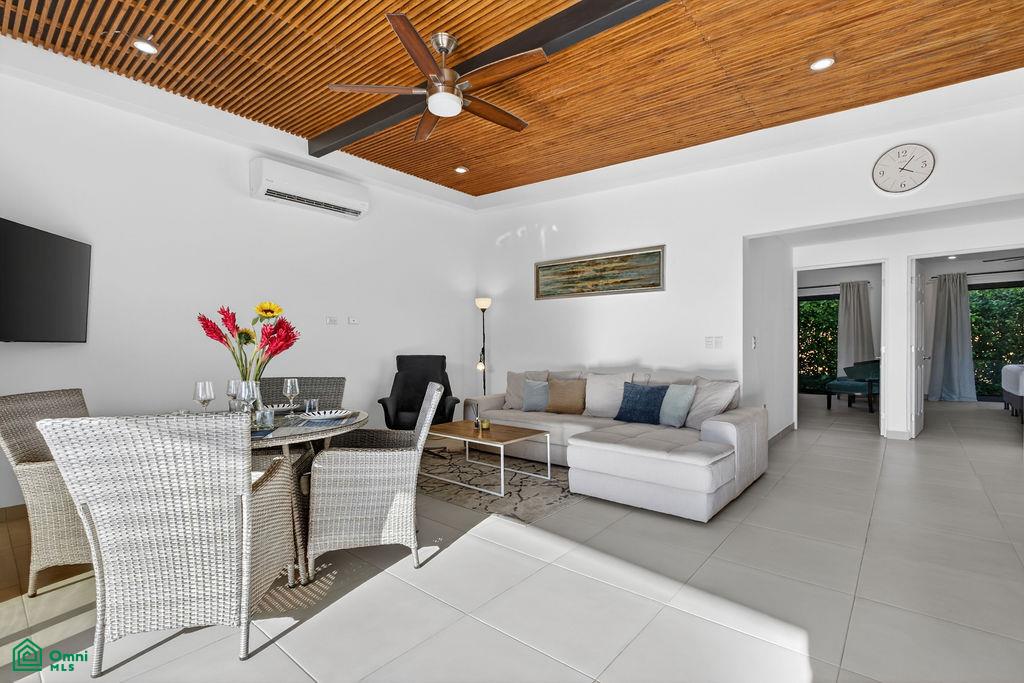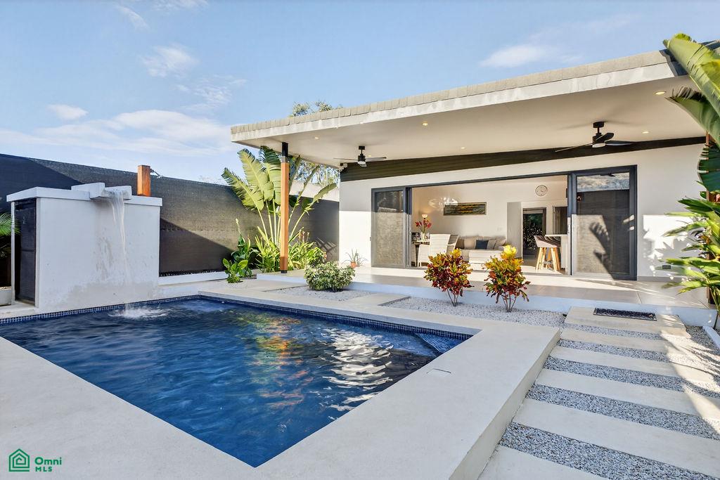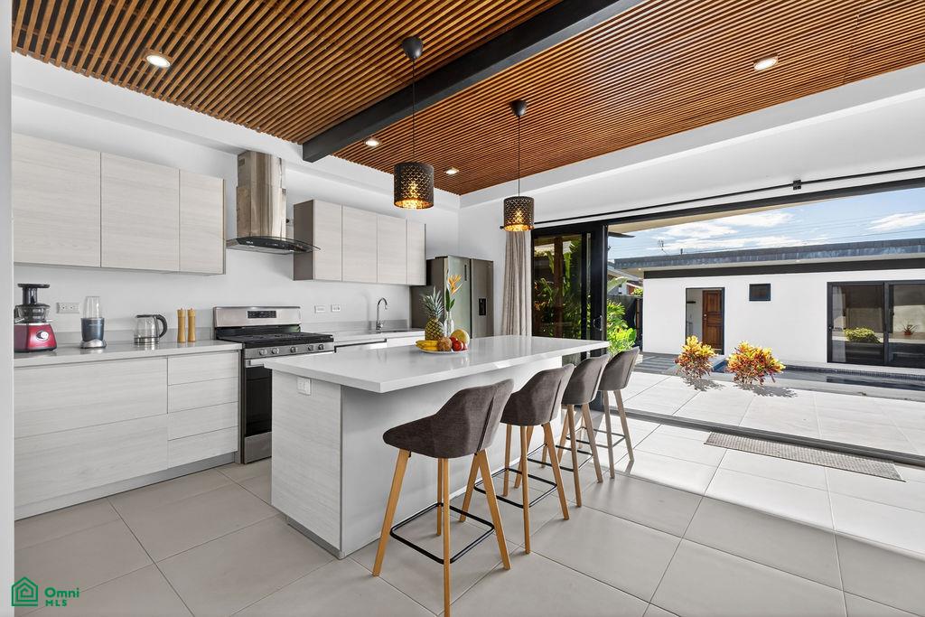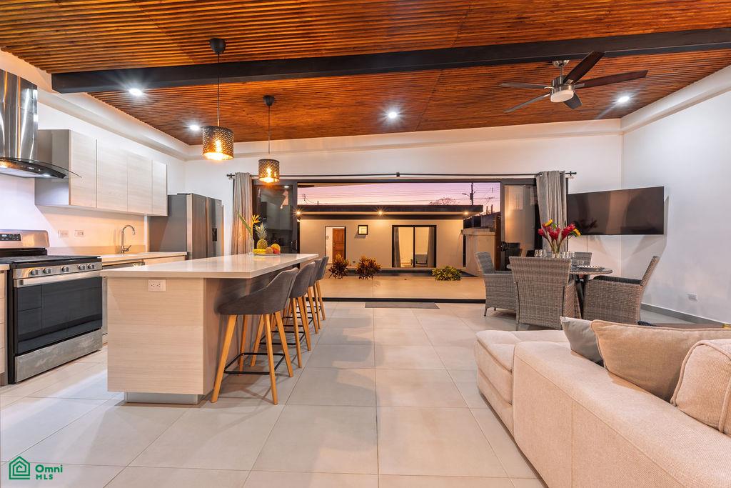 The open-concept layout integrates kitchen, dining, and living spaces with effortless flow. A contemporary kitchen with natural stone island and custom wood accents anchors the home, while expansive sliding glass doors open to a covered terrace, private tropical garden, and elegant pool with cascading water feature — creating a refined yet relaxed resort-style atmosphere.