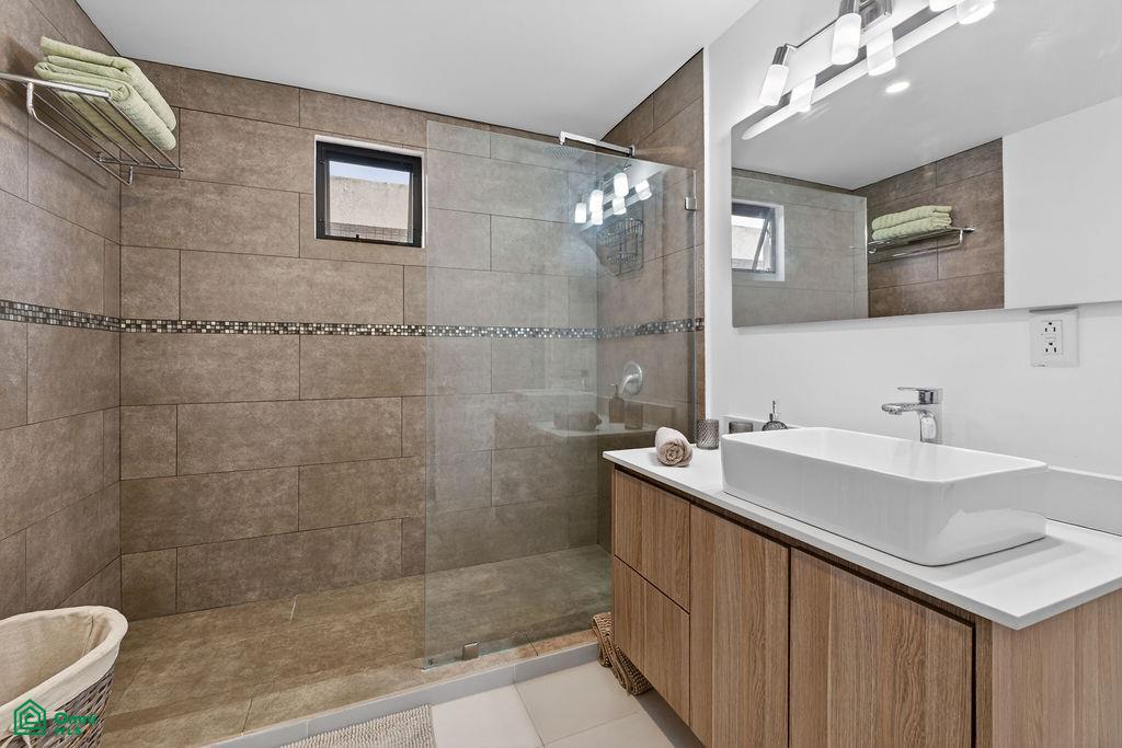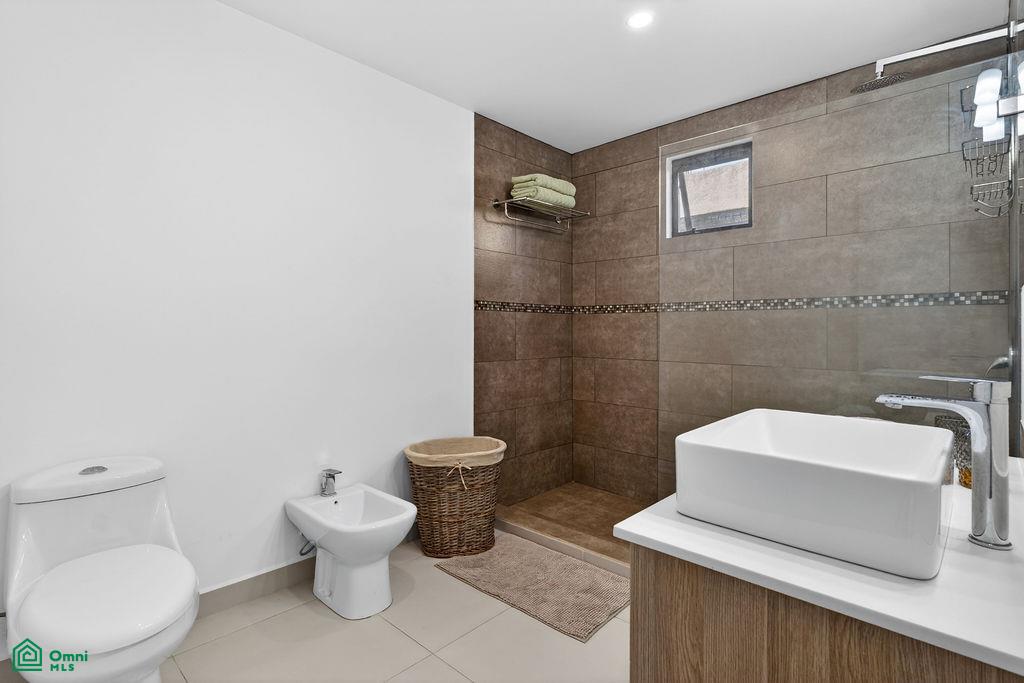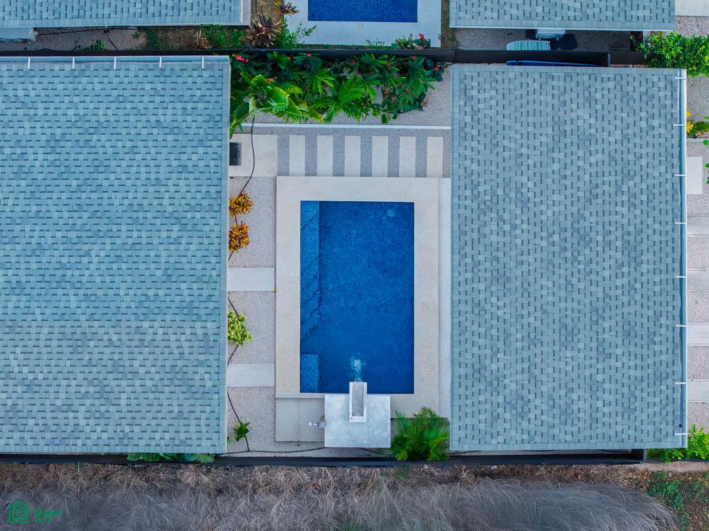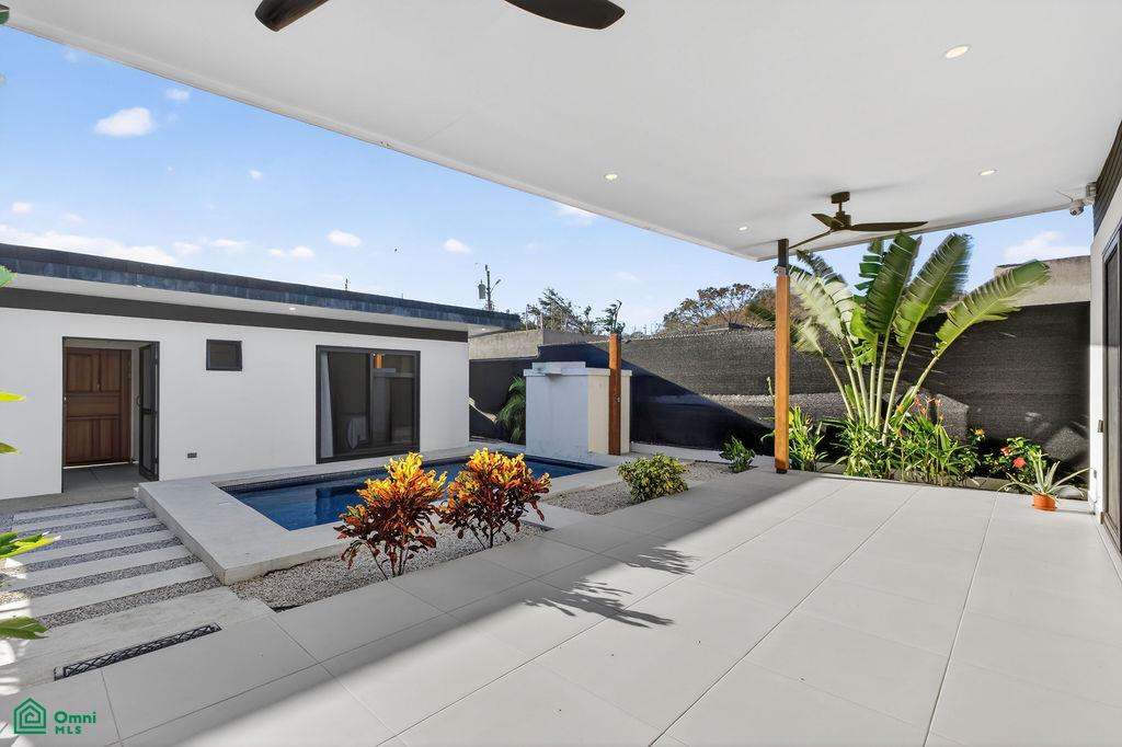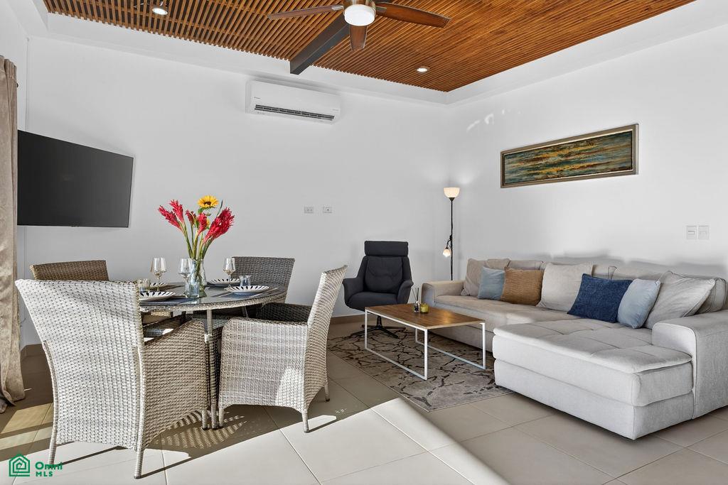 The open-concept layout integrates kitchen, dining, and living spaces with effortless flow. A contemporary kitchen with natural stone island and custom wood accents anchors the home, while expansive sliding glass doors open to a covered terrace, private tropical garden, and elegant pool with cascading water feature — creating a refined yet relaxed resort-style atmosphere.