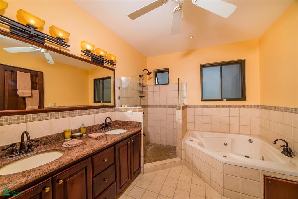 The oversized primary suite enjoys sweeping ocean views, sliding glass doors to the terrace, and a spacious ensuite bathroom. Each bedroom features its own private bath, offering comfort and privacy for family and guests. Covered terraces off both the main living area and primary suite create inviting spaces to enjoy Costa Rica’s year-round tropical climate.