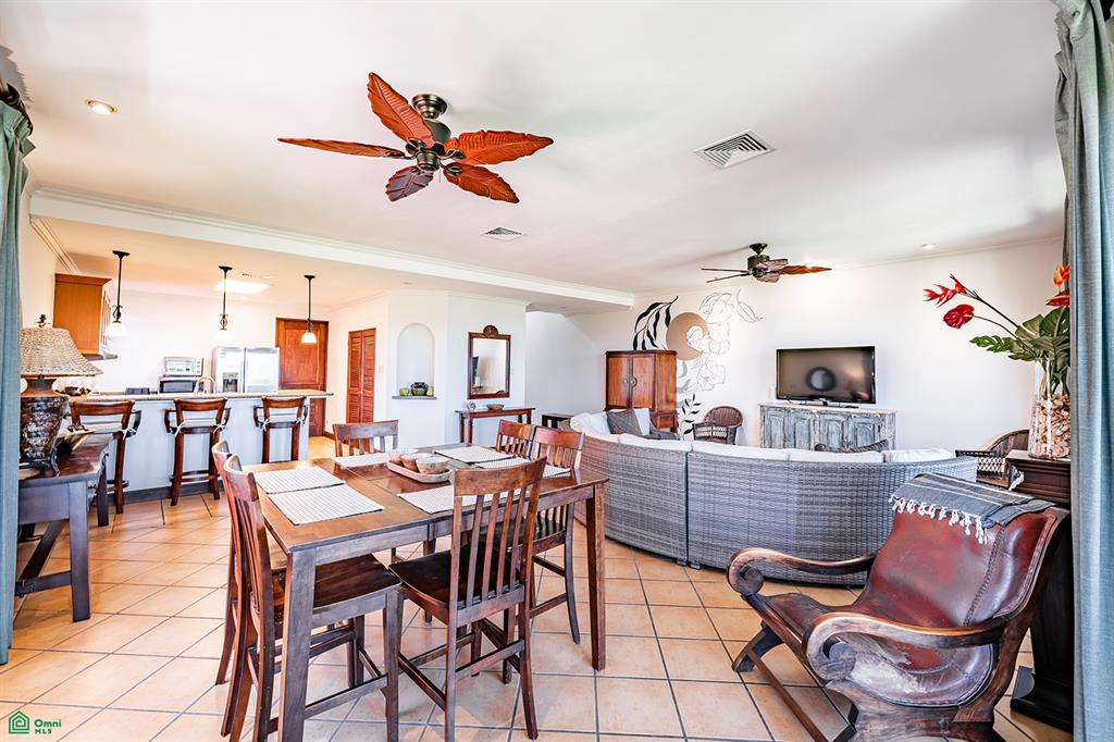 The main level features an open-concept layout designed for entertaining and everyday living. The living room, dining area, and well-appointed kitchen flow together and are filled with natural light. Large sliding glass doors open to a spacious balcony overlooking the Robert Trent Jones II championship golf course, with ocean views beyond—perfect for outdoor dining, relaxation, and entertaining.