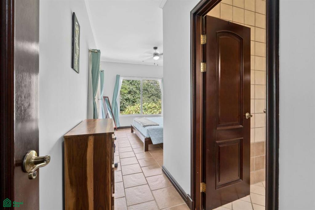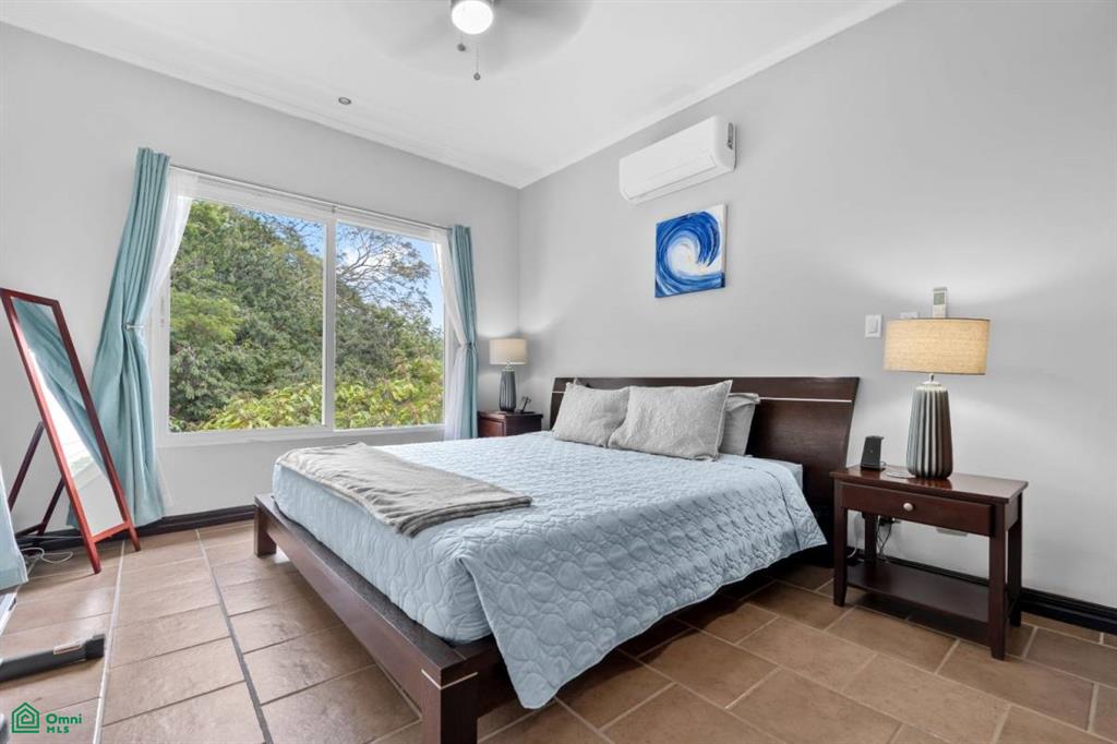 The open-concept living and dining area is filled with natural light and opens through large sliding glass doors onto a generous covered terrace, where cooling ocean breezes and lush tropical canopy views create a serene setting. Monkeys are frequent visitors, adding to the true Costa Rica experience. The kitchen features granite countertops, hardwood cabinetry, and stainless steel appliances, including refrigerator, stovetop, air conditioning units, and hot water heater, along with direct access to a laundry and storage area.