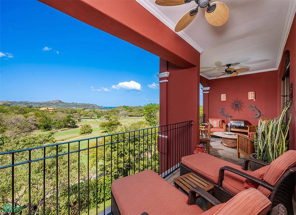 Spread over two stories, this residence seamlessly combines elegance and comfort. On the first floor, you’ll find a spacious living room, dining area, laundry room and a fully equipped kitchen. The kitchen features modern appliances, custom wooden cabinetry, and a granite countertop breakfast bar. The living and dining areas are bright and airy, complete with ceiling fans and large sliding glass doors that open onto a beautiful terrace. The terrace is perfect for relaxing or entertaining, furnished with chairs, lounge beds, and a small grill area. From here, enjoy breathtaking views of the golf course, majestic mountains, and the sparkling turquoise sea. A convenient half-bathroom is also located on this floor.