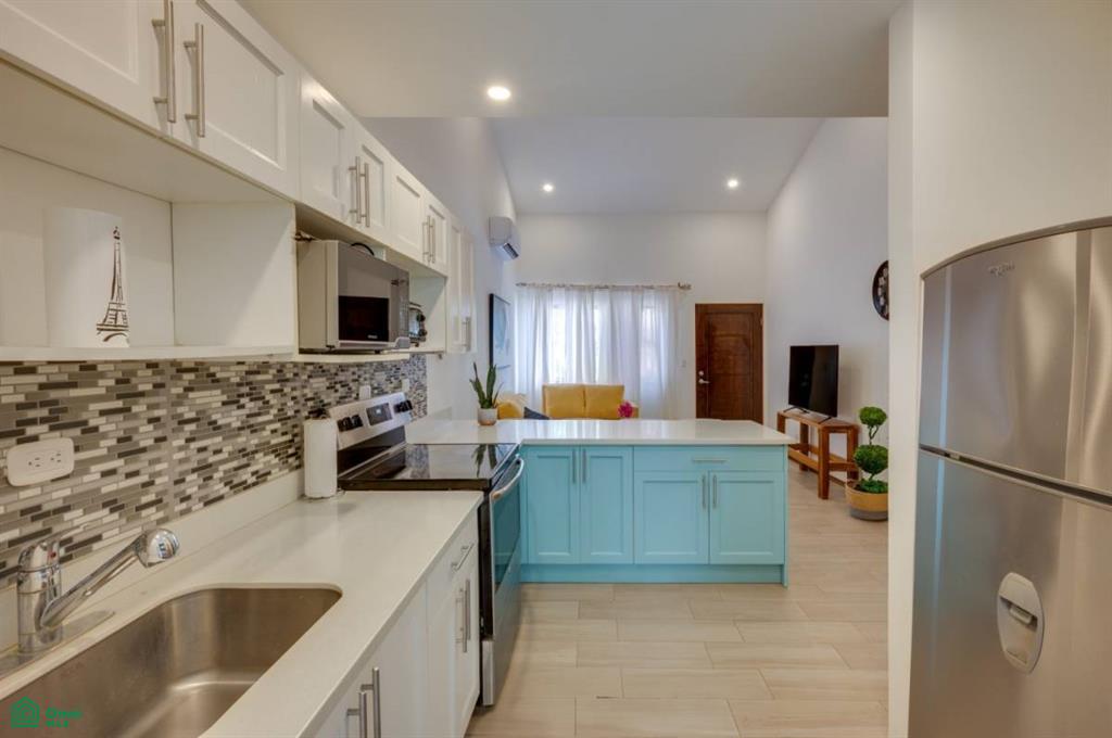 Step inside and you’re greeted by a light-filled living area with soaring ceilings and a fresh, open layout. The space is thoughtfully decorated with warm touches, including a cheerful yellow sofa, contemporary artwork, and a cozy atmosphere that flows seamlessly into the kitchen and dining space. The kitchen features sleek white cabinetry, a decorative backsplash, and a large breakfast bar with seating for four—perfect for casual dining or entertaining guests.