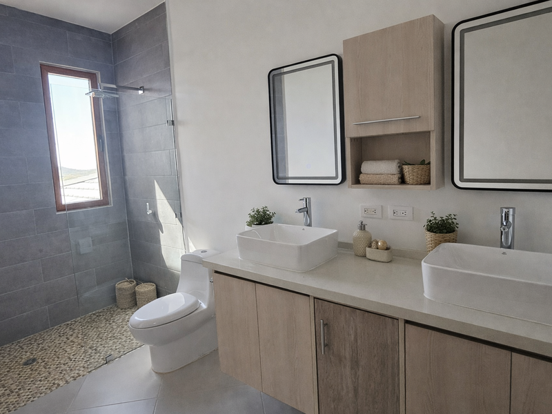 - Luxurious primary bathroom with oversized walk-in shower and dual quartz vanities