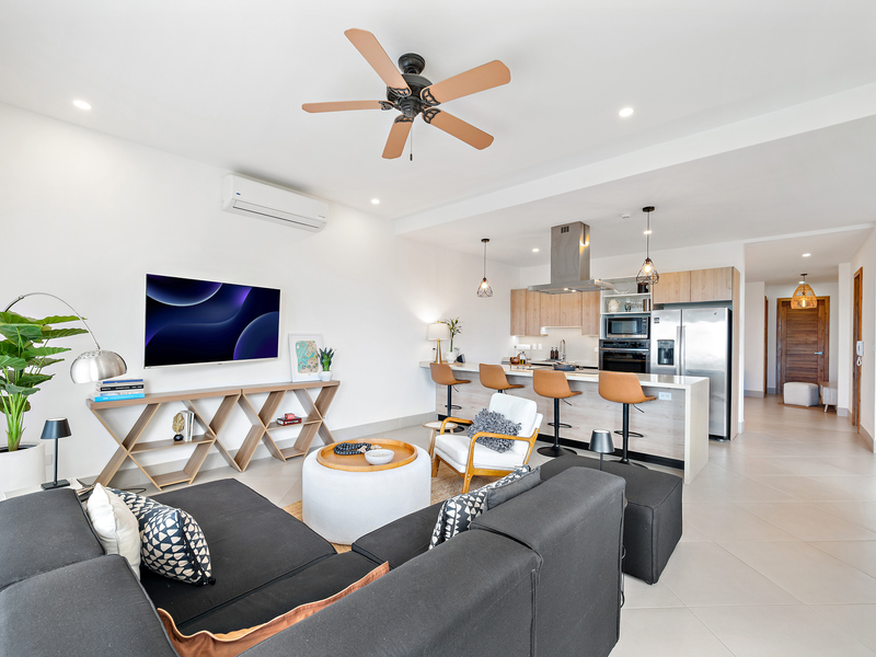 Puesta del Sol Unit #1 features three spacious bedrooms, three and a half bathrooms, and approximately 3,197 square feet of thoughtfully designed living space. The open-concept layout flows effortlessly onto a generous balcony, creating a seamless indoor-outdoor living experience ideal for entertaining or relaxing in the tropical breeze. Soaring ceilings and expansive glass doors fill the home with natural light while framing the stunning coastal scenery.