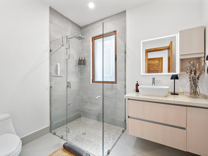 - Luxurious primary bathroom with oversized walk-in shower and dual quartz vanities