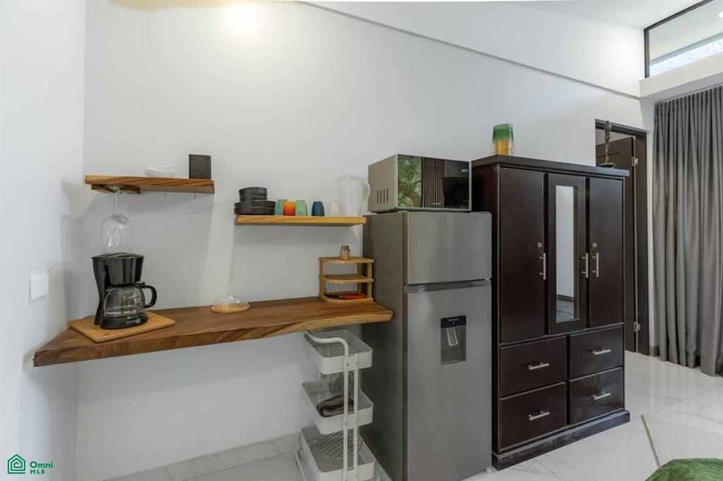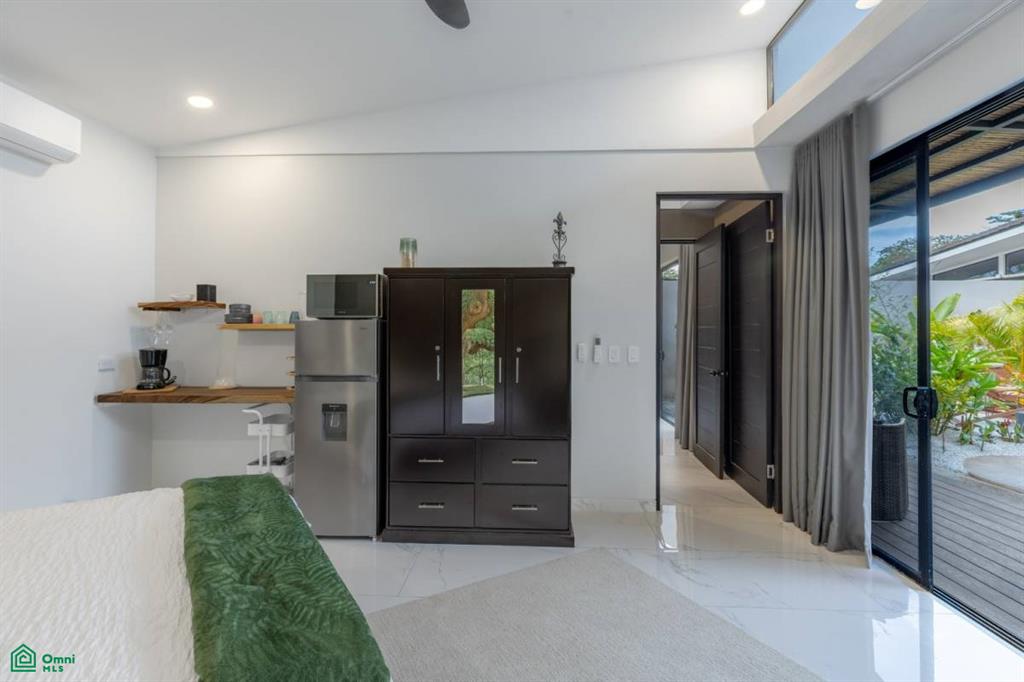 The two additional bedrooms are separate from the main home, situated across the central courtyard garden, providing enhanced privacy for guests or family members. Each bedroom features a handcrafted Guanacaste queen bed, showcasing the home's dedication to high-quality craftsmanship and furnishing. One of the bedrooms includes a kitchenette equipped with a refrigerator, freezer, microwave, and coffee maker, offering added convenience. Both rooms have independent access from the parking area, allowing for private entry without passing through the main