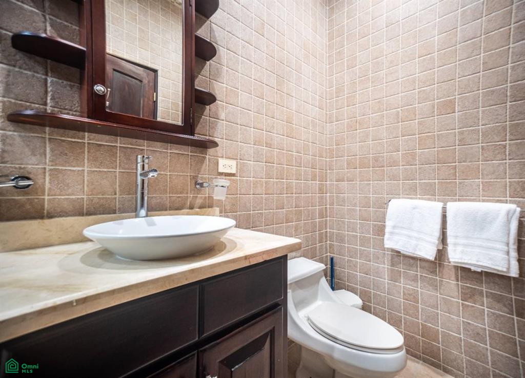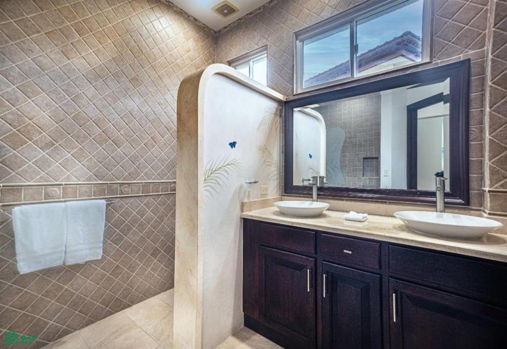 On the upper floor, the main bedroom features a king size bed, a private bathroom, and a walk in closet. The two additional bedrooms, also with their own bathrooms and spacious closets, offer privacy. From the shared balcony, you can enjoy the views.