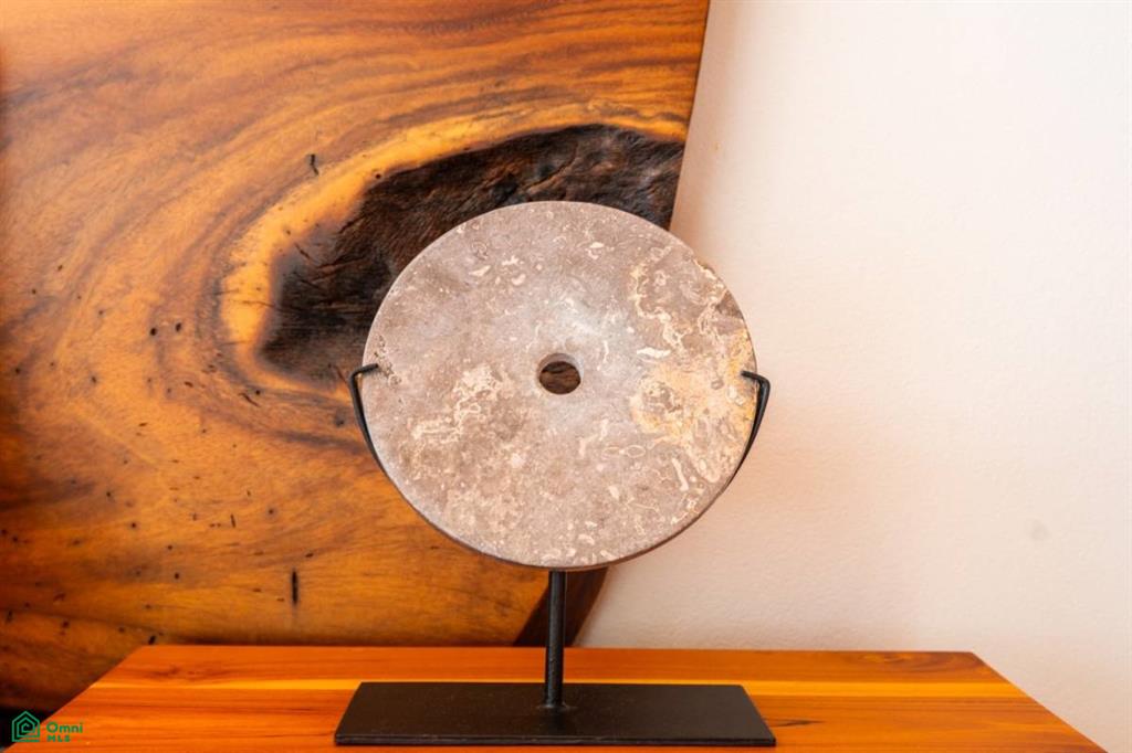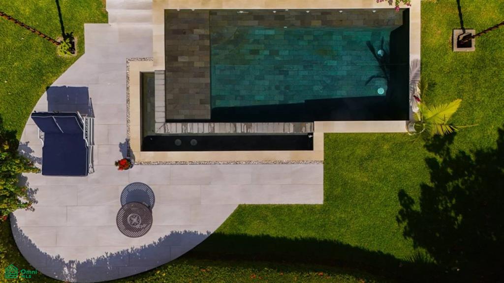 From the kitchen, two sets of oversized glass sliding doors lead to a double-level entertainment patio and a beautiful modern pool finished with natural gray stone. The pool features a baja platform with a bench running the length of the pool, as well as an infinity edge that visually merges with the ocean and mountain horizon. On clear days, the pool reflects the sky, and in the evenings it becomes the perfect setting to enjoy vibrant sunsets with colorful reflectio
