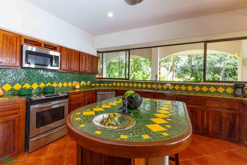 Two spacious guest suites, each with teak cabinetry and private patios with ocean and jungle views, offer comfort and privacy on opposite wings of the