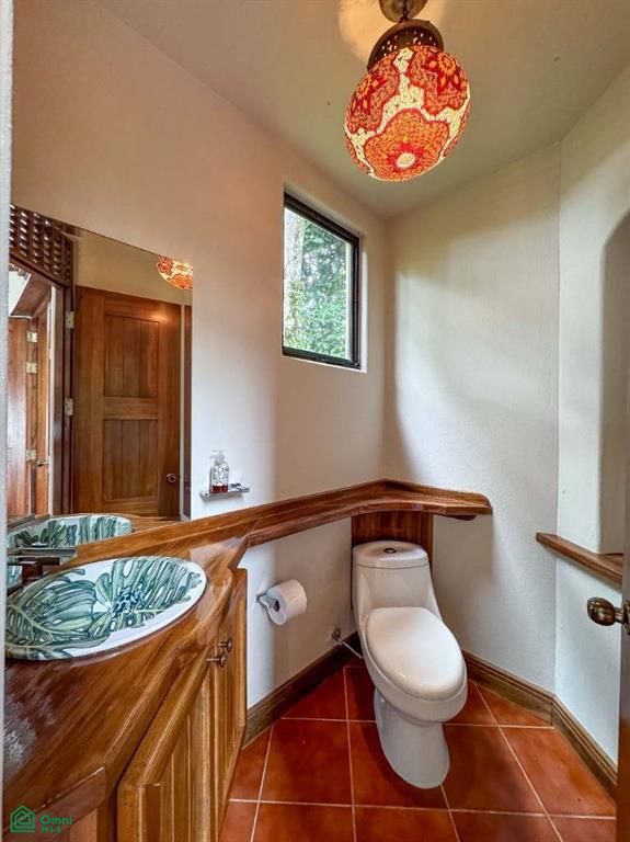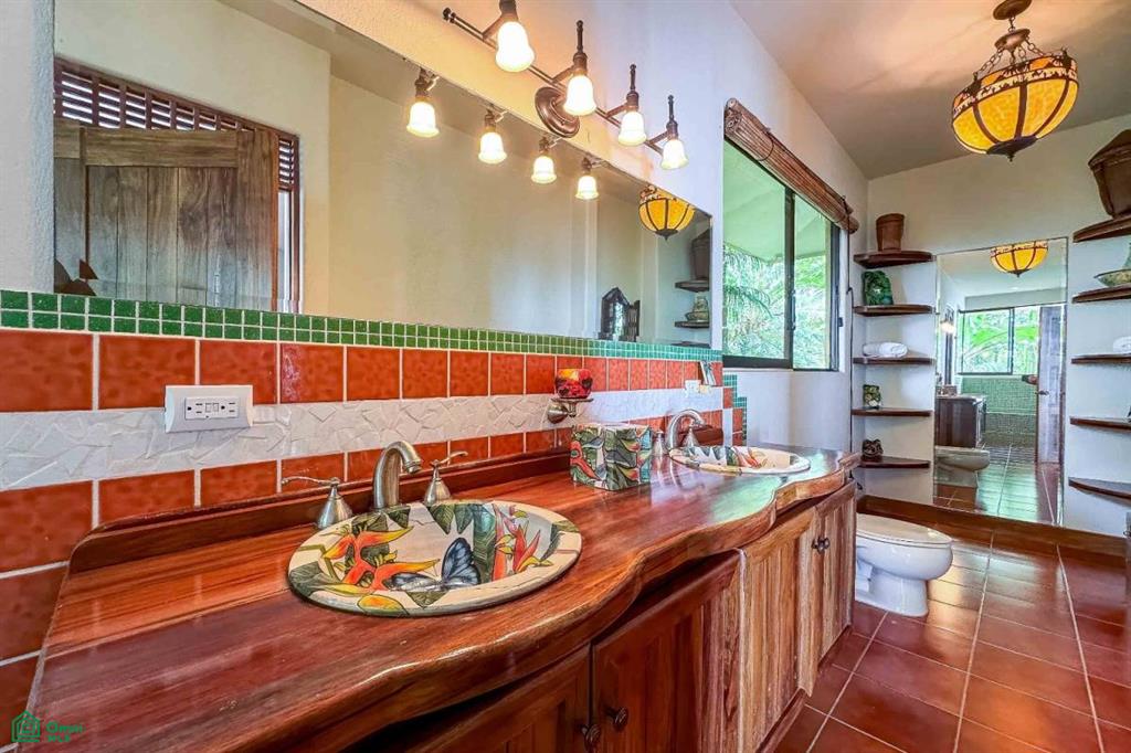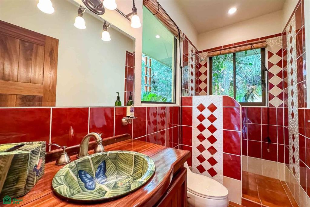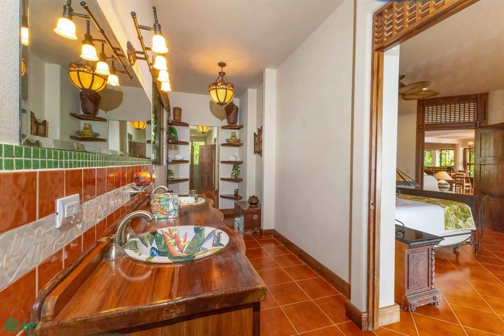 From the suite’s wrap-around balcony, you can take in the same breathtaking ocean views as the main level—while also enjoying the rare experience of being eye-level with monkeys traveling through the neighboring conservation area and toucans calling from the treetops. The spacious ensuite includes hand-laid mosaics, a double vanity, an antique claw-foot tub, and an outdoor shower. A window-lit walk-in closet crafted with custom teak cabinetry enhances the suite’s sense of luxury.