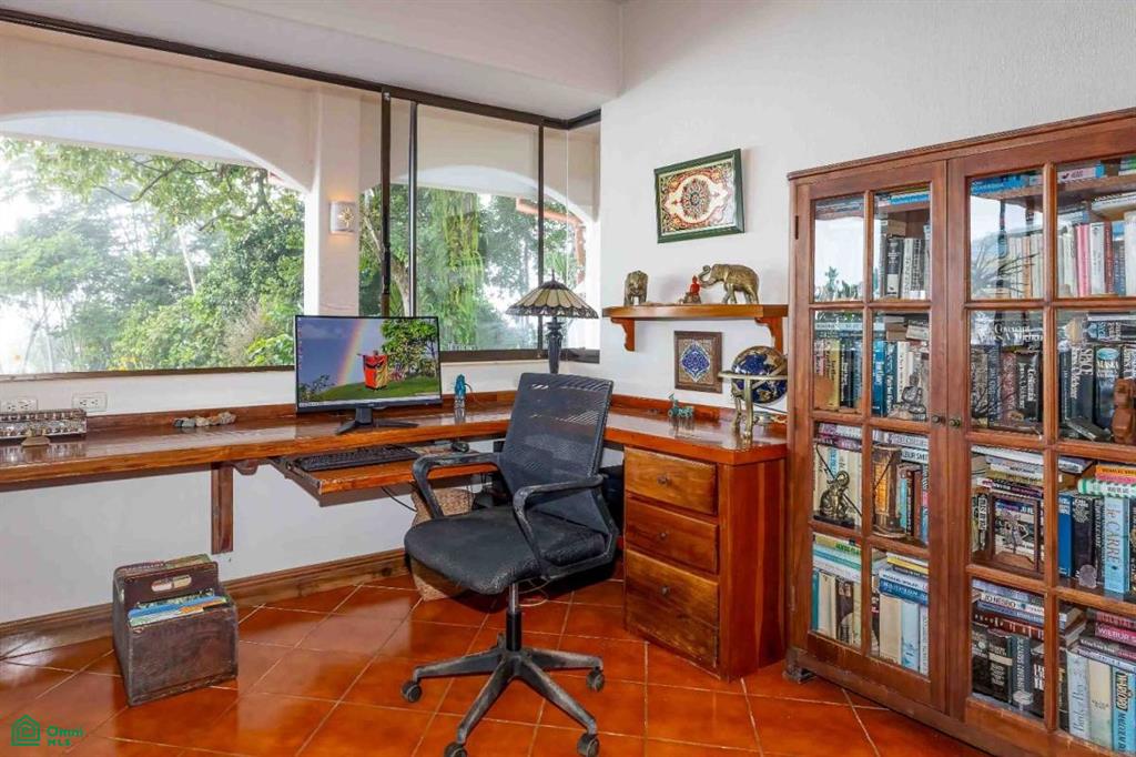 The main level is warm, open, and inviting. A generous living area with a circular conversation sofa is paired with an additional sitting room or office. Much of the handcrafted furniture is included with the home, offering a seamless move-in experience.