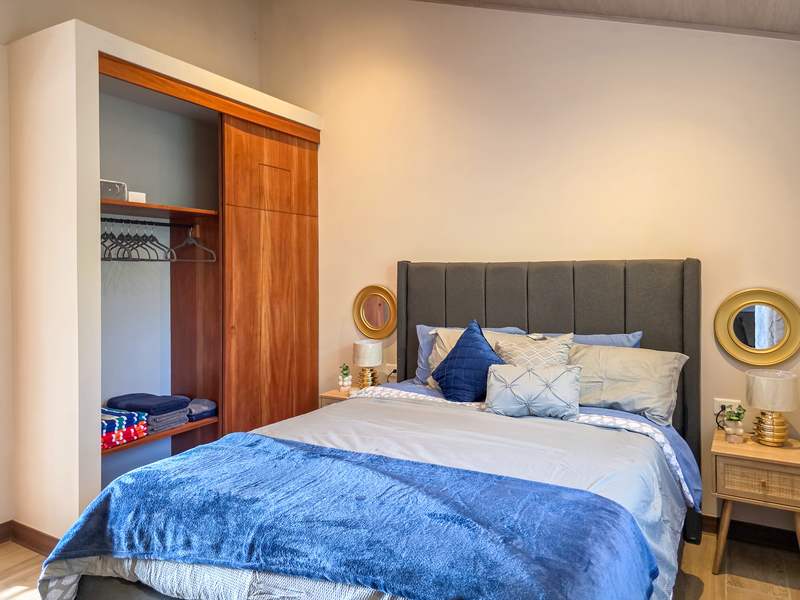 Inside, measuring 112 square meters, “Villa Palladio” includes a spacious double-height living area, divided into a living room, dining room, and kitchen with an island and breakfast bar, as well as an adjacent laundry room. Three bedrooms and two bathrooms, one of which is exclusively for the master suite that also features two walk-in closets, provide direct access to this central area. The bedrooms accommodate 6 people, and by replacing the queen bed in one of the secondary bedrooms with a double bunk bed, the villa can sleep 8 guests.