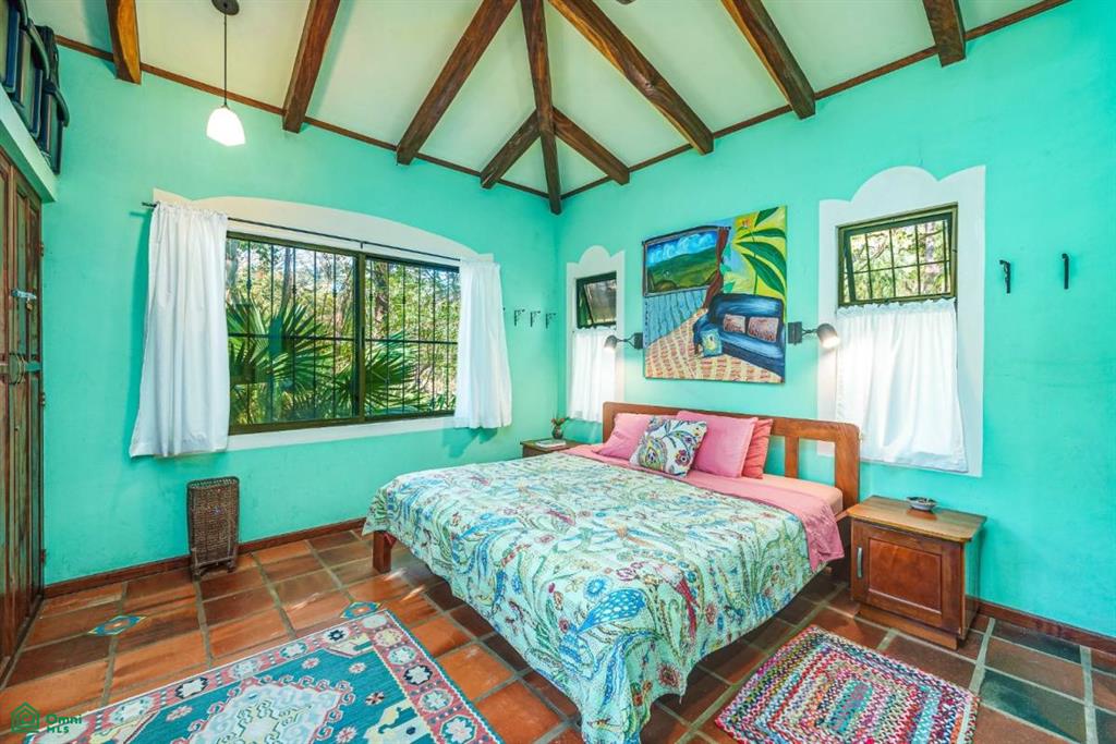 The main living area evokes the feeling of a garden patio intertwined with a cozy Mediterranean retreat. For those dreaming of immersing themselves in the fresh air and lush Costa Rican forests, this is the perfect sanctuary.
