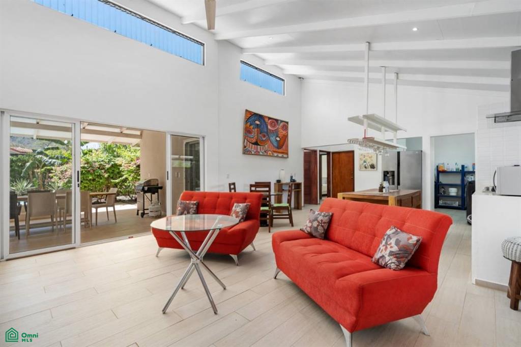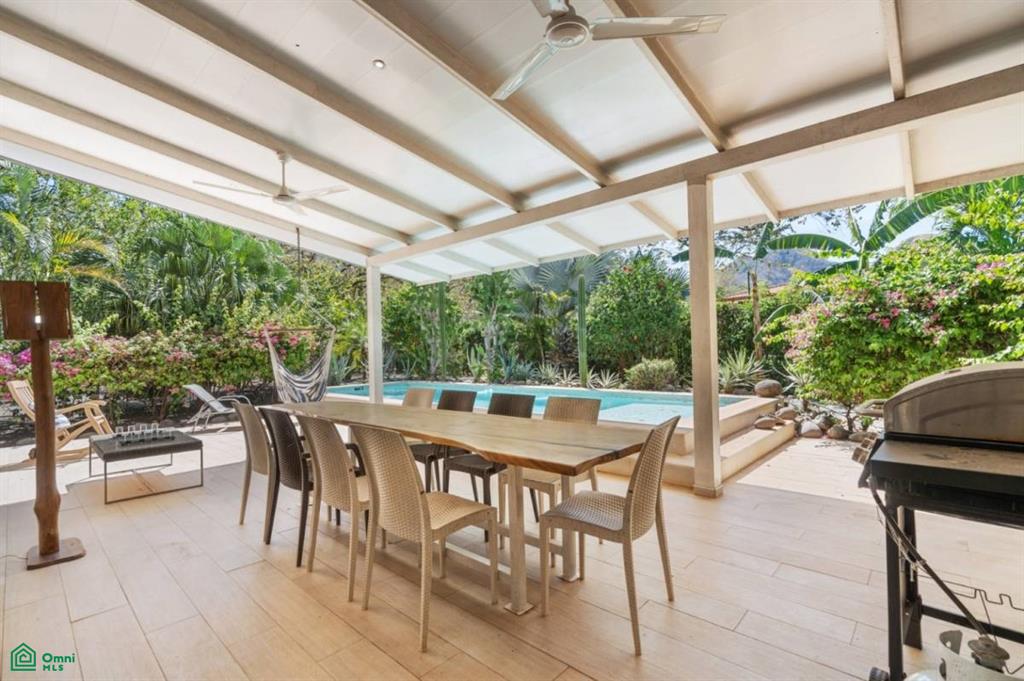 Recent updates within the past year include a new water tank, some pool equipment and a new washer. The open-concept kitchen—featuring a gas stove—flows seamlessly into the living and dining areas, creating an ideal space for indoor-outdoor entertaining.