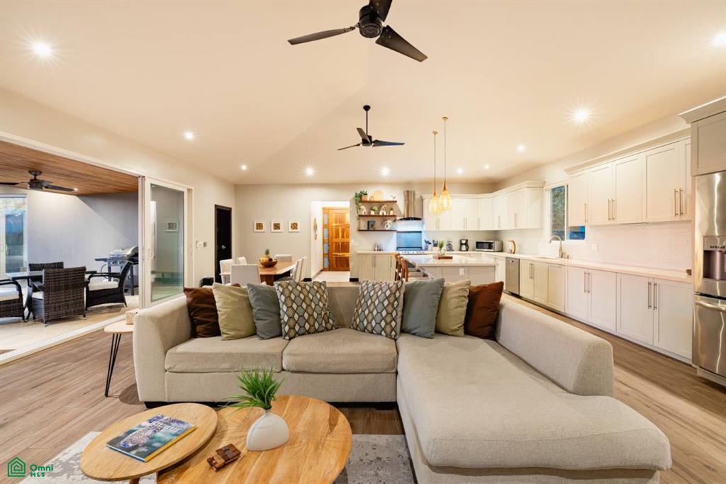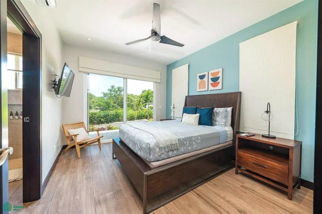 The home’s minimalistic design and vaulted ceilings create an open, welcoming atmosphere. The open-concept layout fosters a sense of togetherness, while the gourmet chef-inspired kitchen – complete with stainless steel appliances, breakfast bar, and granite countertops – flows seamlessly into the living and dining areas. The living space connects with the outdoors, with accordion glass doors providing uninterrupted views of the infinity pool and the ocean and mountains beyond.