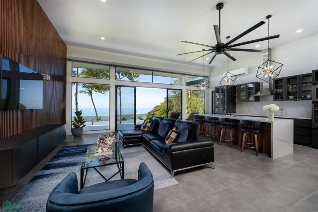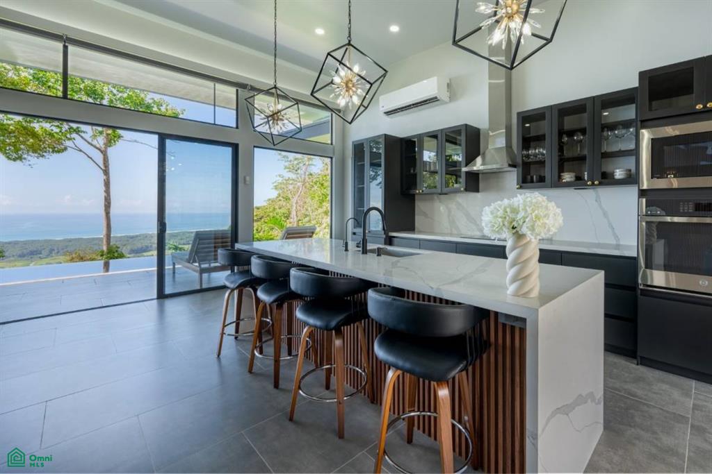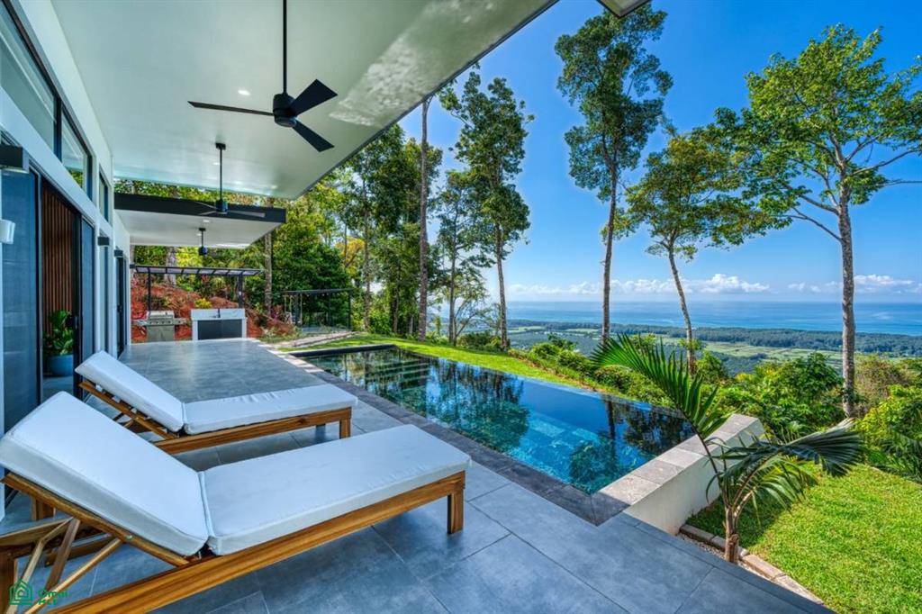 Outdoor living is just as luxurious. The expansive covered front balcony overlooks the pool and ocean, equipped with ceiling fans, ambient lighting, and custom teak furniture built for style and durability. Meandering paths lead to two serene outdoor lounge areas: one under a pergola with a swinging chair ideal for sunrise yoga or morning meditation, the other tucked in the front courtyard—a perfect spot for savoring your morning coffee as the sun rises over the hills.