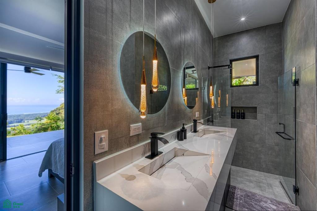 The living room centers around a dramatic feature wall with a hidden door leading into the primary suite—a private sanctuary of comfort and design. Two of the three bedrooms boast ensuite bathrooms, each adorned with dual vanities, integrated quartz sinks, floor-to-ceiling tiled walls, and striking black fixtures. Every bedroom enjoys sweeping ocean views, while the third offers quick access to a serene outdoor bathtub complete with custom water features. A third full bathroom, finished to the same impeccable standard, conveniently serves both guests and the common areas.
