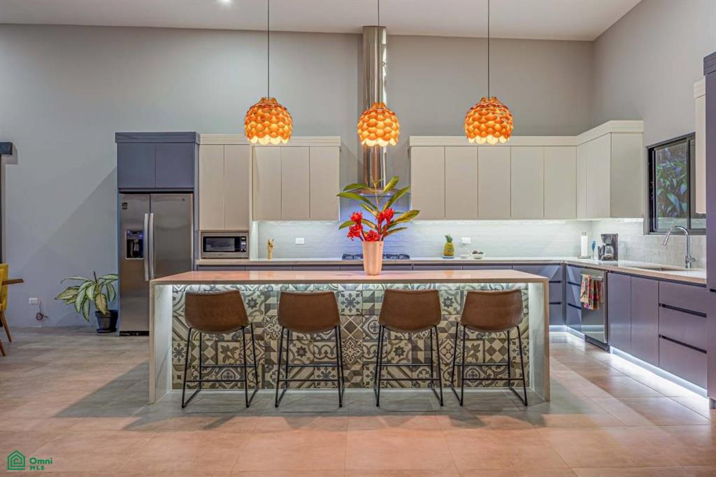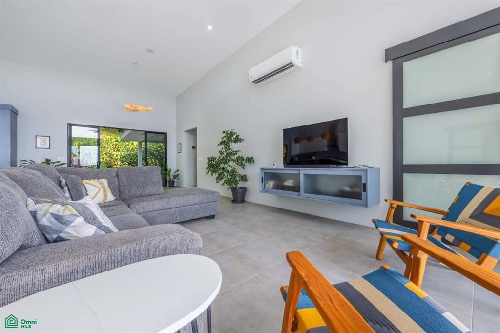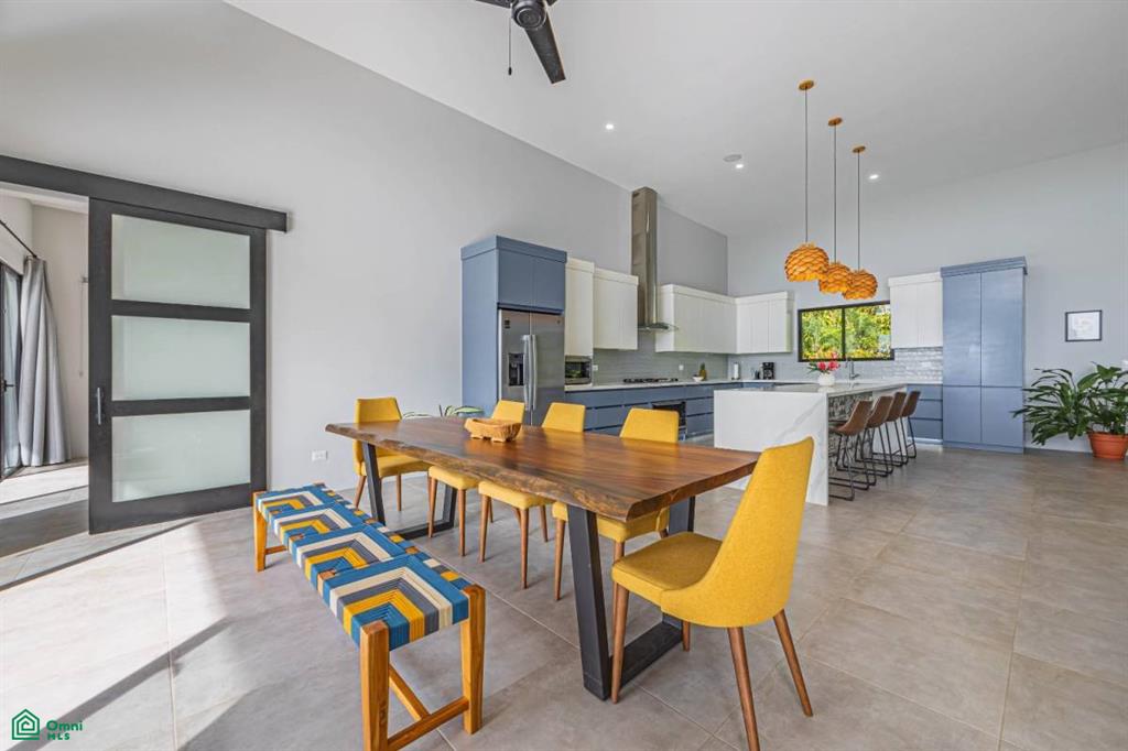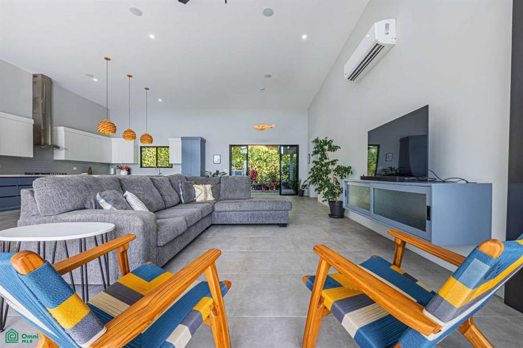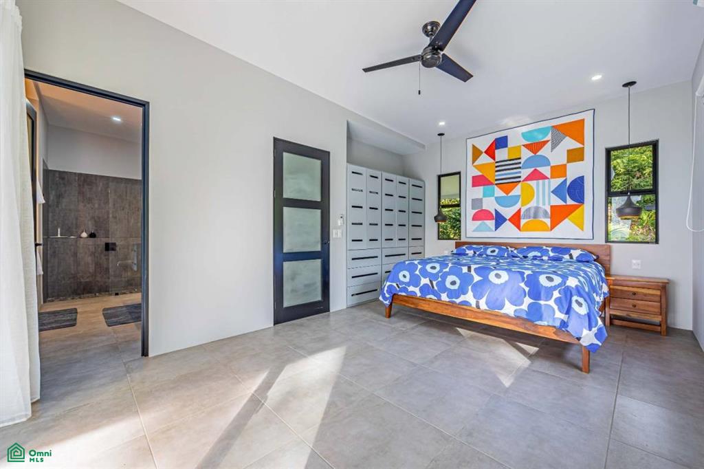 The home comes fully furnished with exceptional pieces, including a solid Guanacaste wood dining table that seats eight, and handwoven Masaya fabric chairs and benches in the living room. Two of the three bedrooms are outfitted with luxurious king beds and premium linens, while the third bedroom offers both a queen and twin Guanacaste wood bed set.