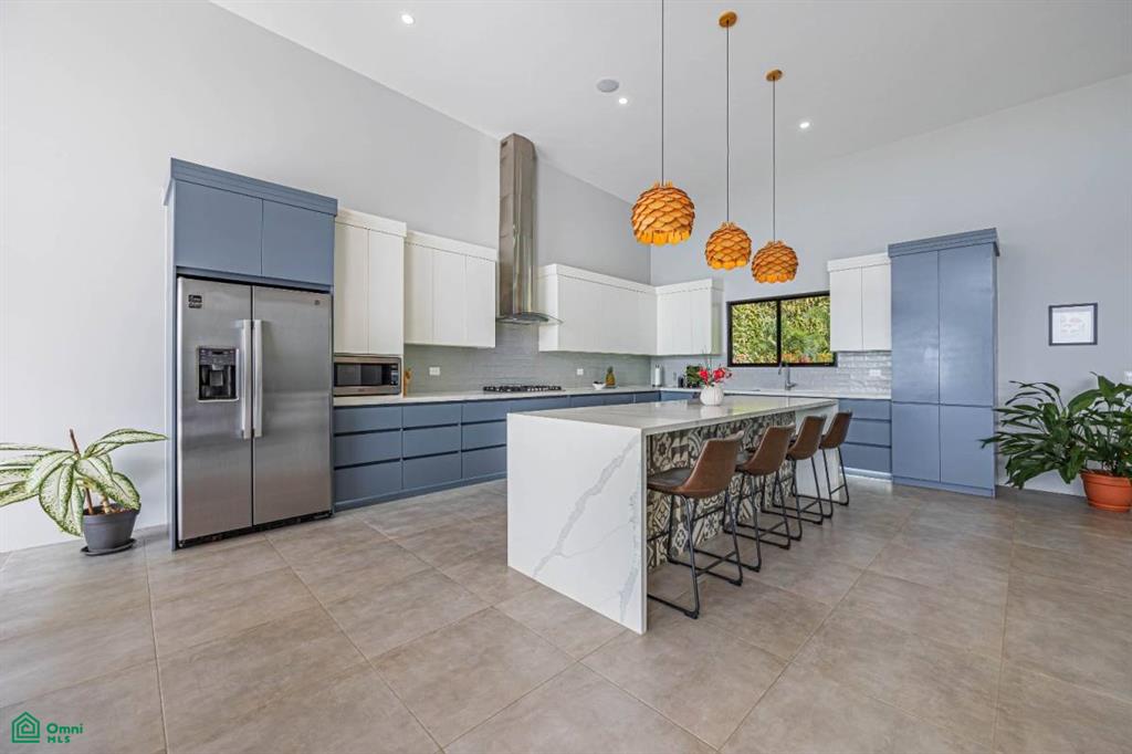 This single-level masterpiece, built in 2022, is perfect for a large family or a couple seeking a serene retirement haven. The open-concept design seamlessly connects modern luxury with natural beauty. The oversized great room features top-of-the-line appliances, including a high-grade electric convection oven, a five-burner propane cooktop, a 28-cubic-foot refrigerator with an ice maker, a dishwasher, and a garbage disposal. All are complemented by expertly crafted cabinetry and stunning Italian-imported quartz countertops.