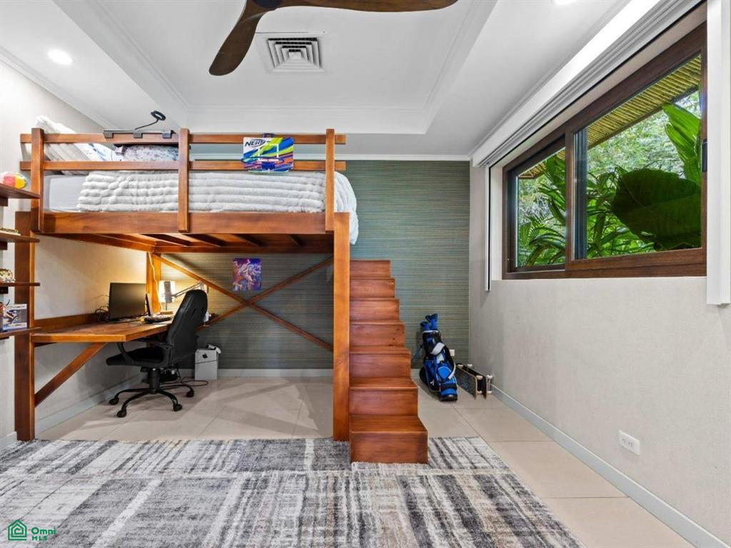 A second main-level bedroom features a loft bed with a desk and garden views. It offers extra closet space.