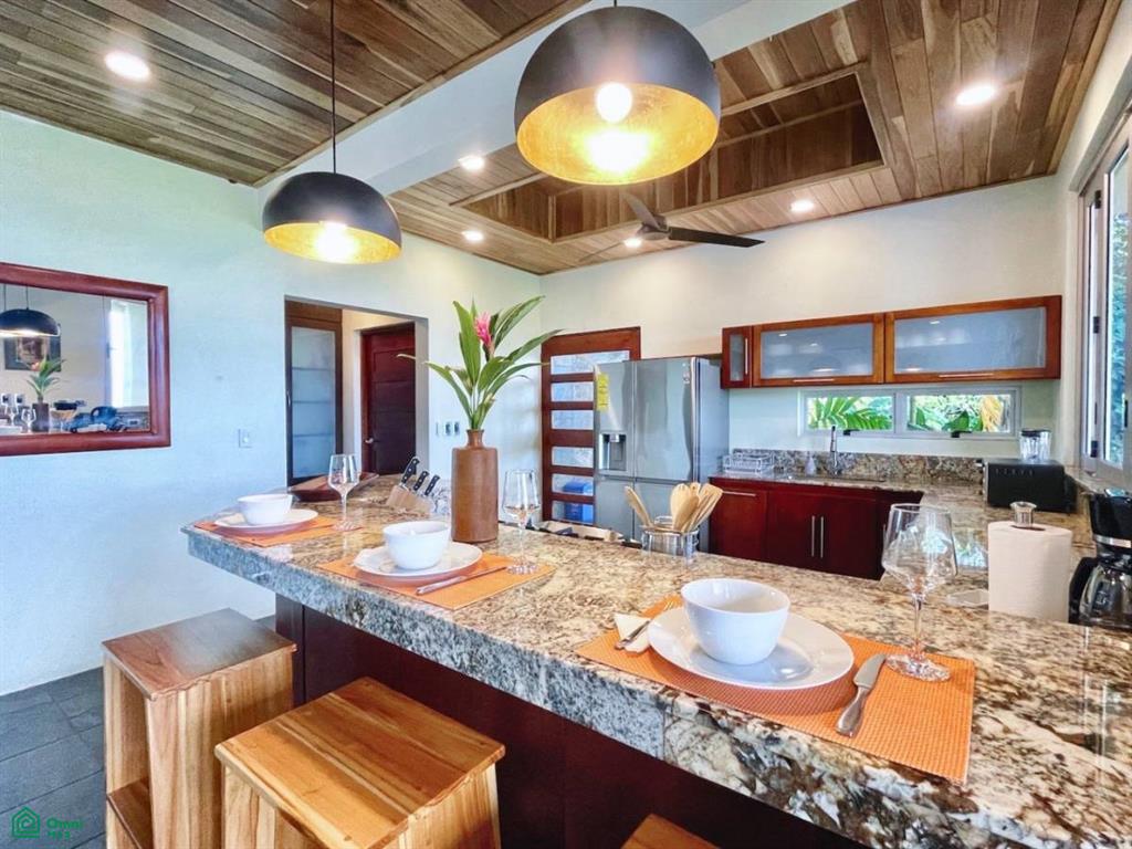 All four bedrooms have comfortable queen or king size beds, air-conditioners, ceiling fans, and en-suite bathrooms with modern fittings that all harmonize with the décor. The open floor plan kitchen is built to the standards of a professional chef and fitted with granite countertops, gas cooktop, and all the latest modern appliances.
