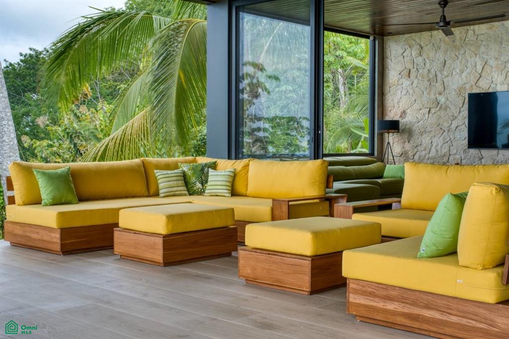 The living area of Hermosa Retreat is a testament to tropical elegance. It opens up to a sprawling outdoor terrace adorned with comfortable sofas and a hammock, creating an idyllic setting for relaxation amidst the tranquil beauty of nature. This terrace serves as a peaceful sanctuary, perfect for yoga enthusiasts and those seeking a quiet place for meditation.