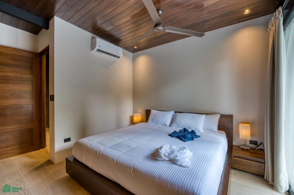 For leisure and refreshment, the villa presents a stunning infinity pool, ideal for cooling off during the warm tropical afternoons. The residence is not only about comfort but also ensures convenience and connectivity, featuring state-of-the-art amenities such as air conditioning throughout and high-speed fiber internet with speeds up to 100Mbps.