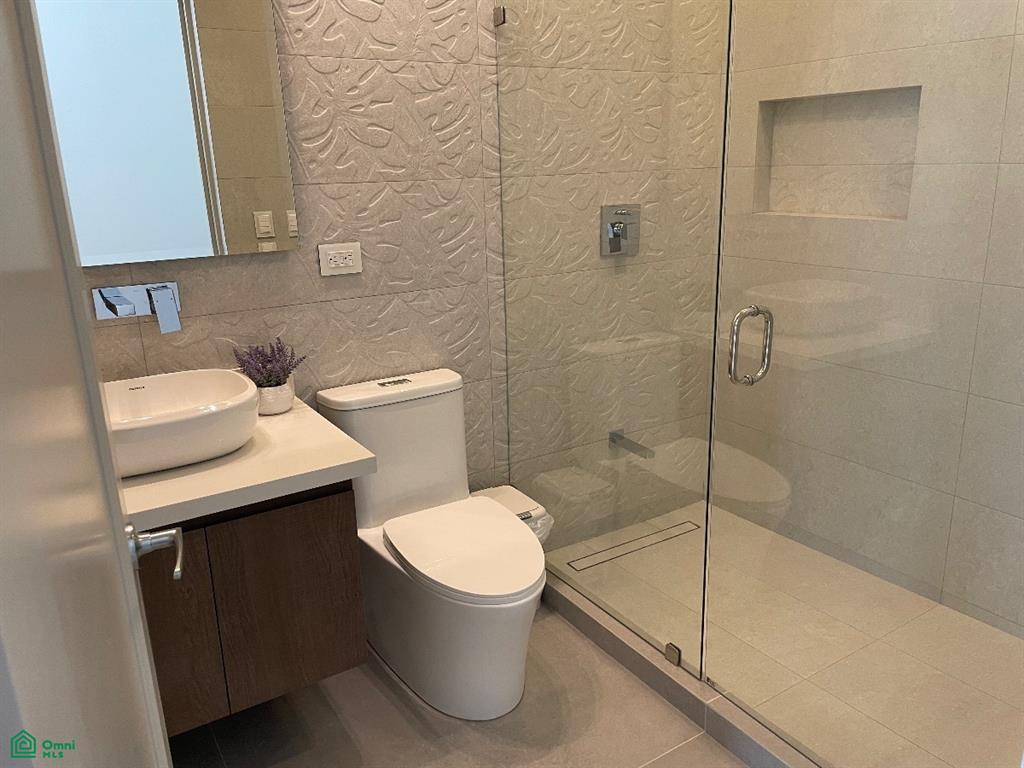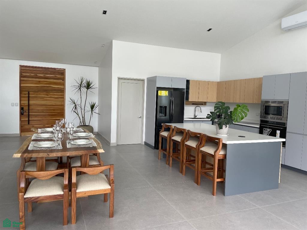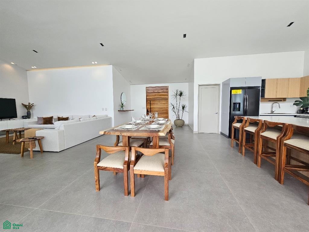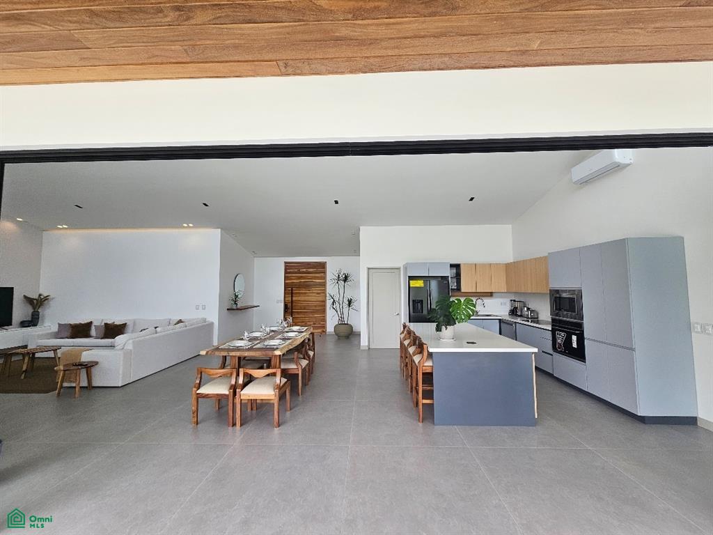 From the moment you enter through the grand teak doorway with a smart lock, you are greeted by a breathtaking open-space concept that spans 948 ft², comprising the living, dining, and kitchen areas. The seamless glass sliding doors frame a spectacular view of the infinity pool and the expansive ocean horizon, creating a perfect backdrop for the stunning Guanacaste dining table that comfortably seats eight.