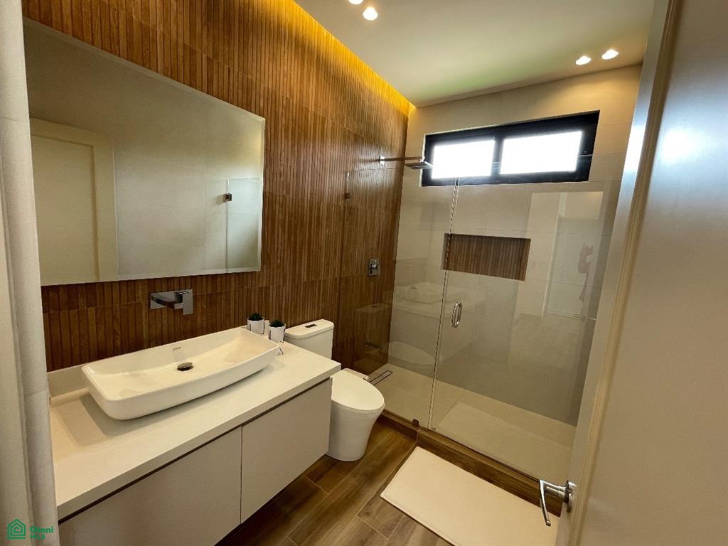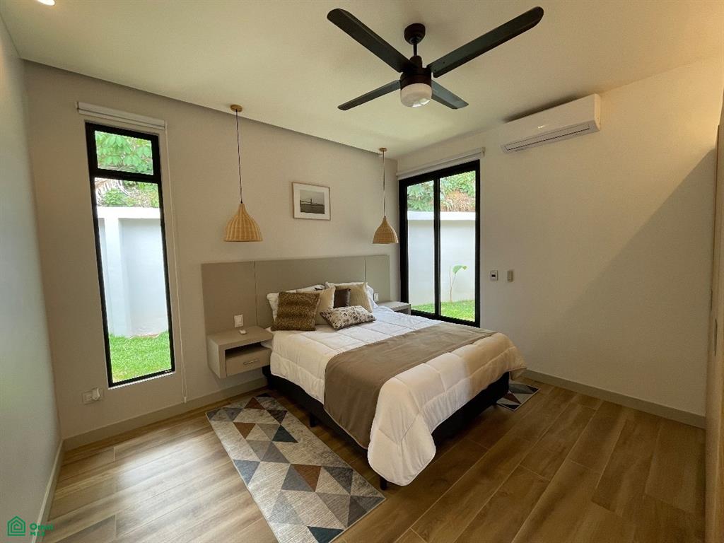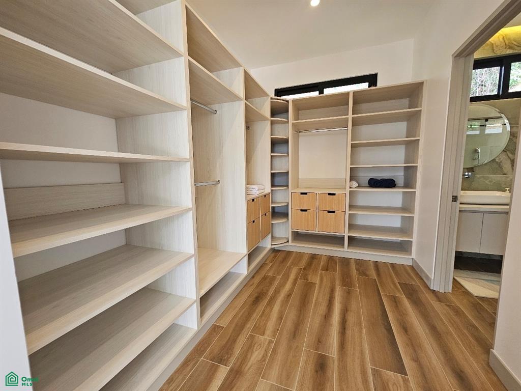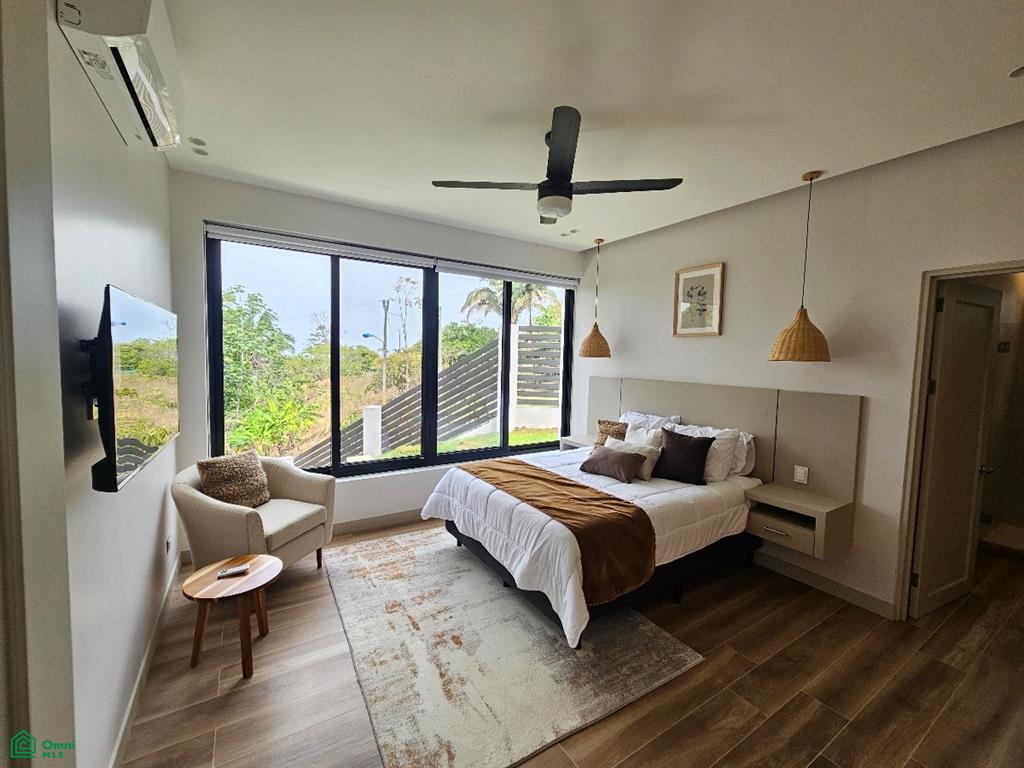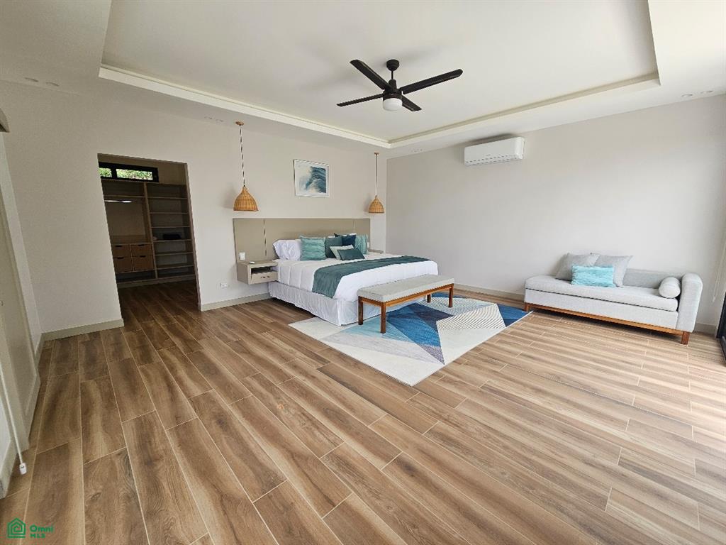 The south wing of Casa Iguana houses a luxuriously appointed master bedroom with king-size bed, a walk-in closet with built-in rotating shoe storage, and an en-suite bathroom adorned with onyx green tiles and dual rainfall shower heads. The north wing includes two equally lavish bedrooms, each with its own stylish en-suite bathroom and modern comforts, including a 64” TV and air conditioning.