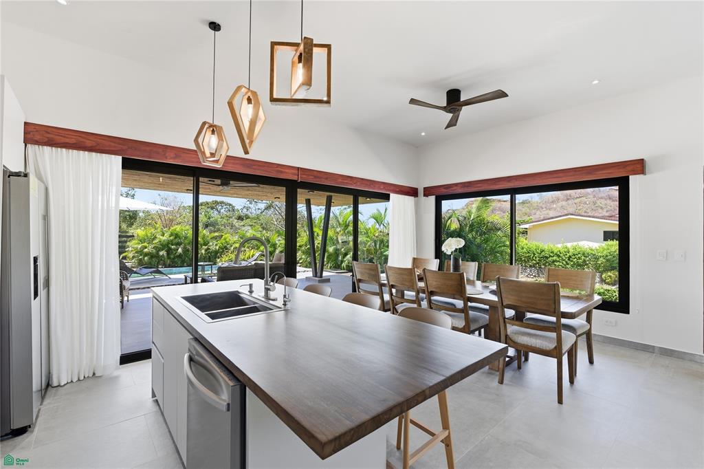 The home features an open concept layout filled with natural light, high ceilings, and expansive sliding glass doors that connect the main living areas directly to the covered terrace and private swimming pool. Clean modern finishes and thoughtful design create a comfortable yet refined atmosphere ideal for full-time living, vacation use, or investment. The kitchen is appointed with modern cabinetry, quality appliances, and a breakfast bar that flows naturally into the dining and living spaces, making it ideal for entertaining.